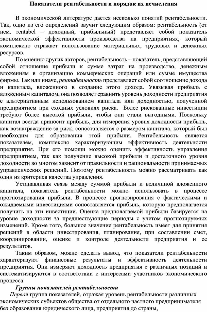 В экономической литературе дается несколько понятий рентабельности. Так, одно из его определений звучит следующим образом: рентабельность (от нем. rentabel – доходный, прибыльный) представляет собой показатель экономической эффективности производства на предприятиях, который комплексно отражает использование материальных, трудовых и денежных ресурсов.