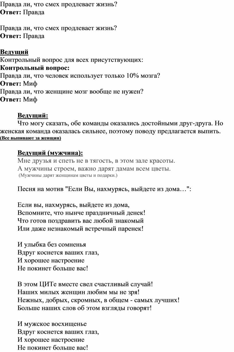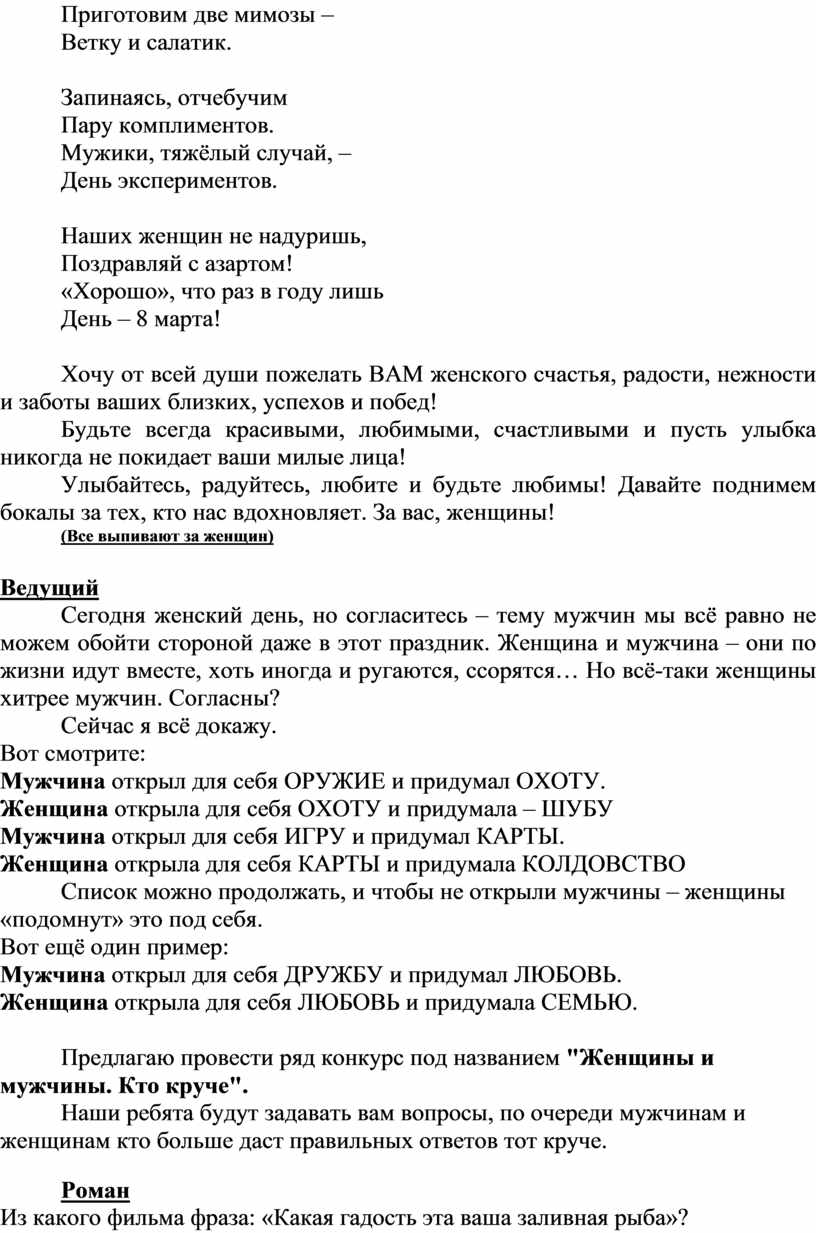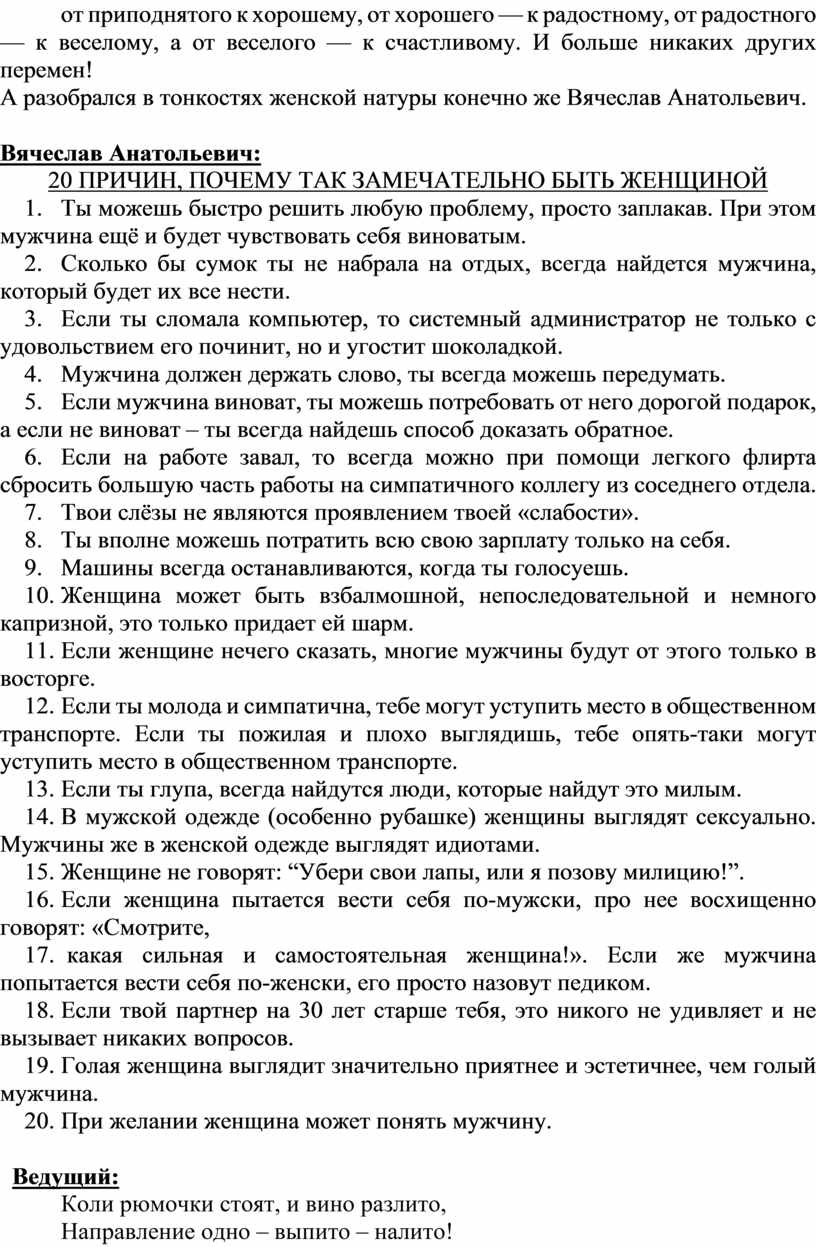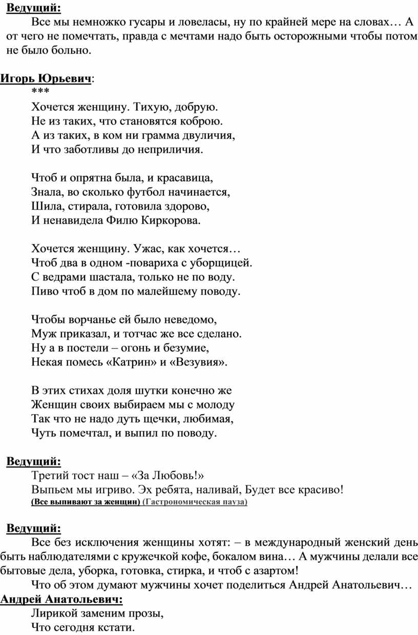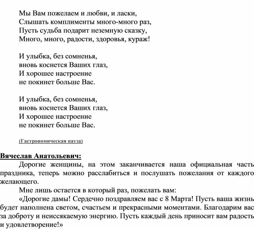 Дорогие женщины, на этом заканчивается наша официальная часть праздника, теперь можно расслабиться и послушать пожелания от каждого желающего.