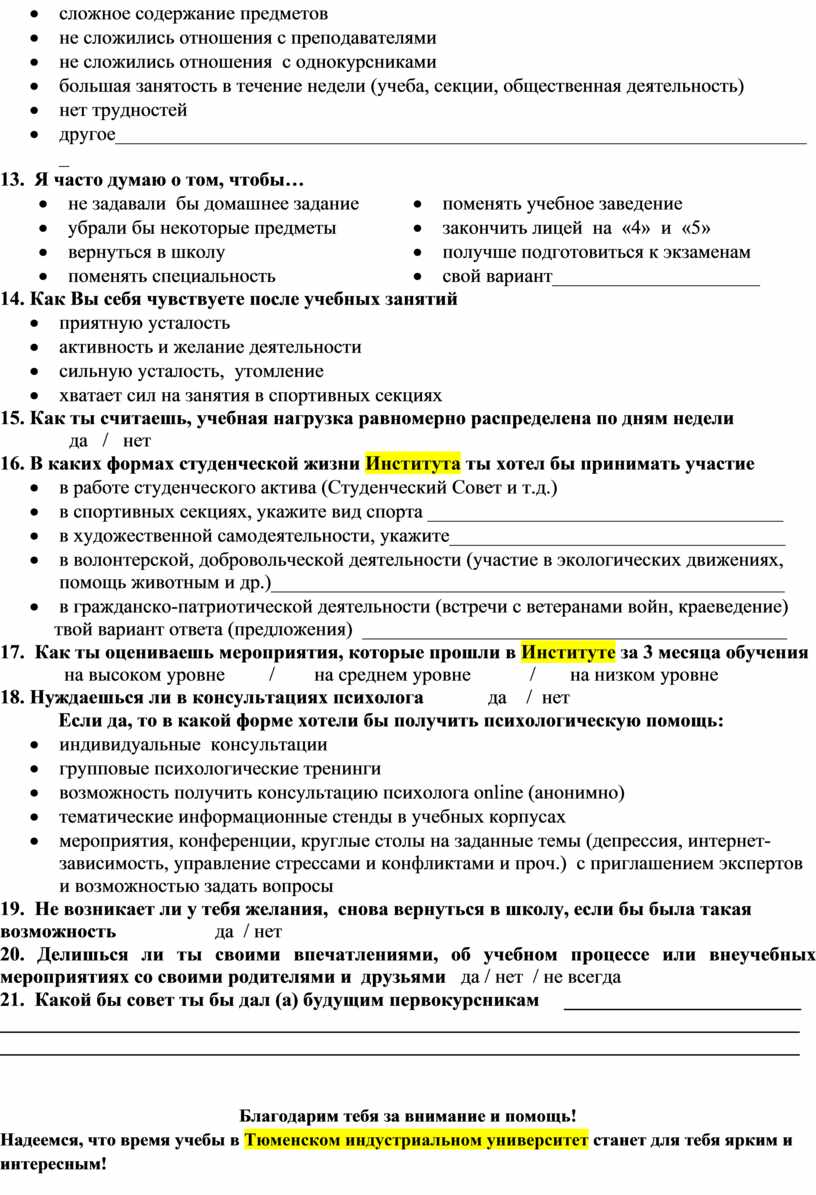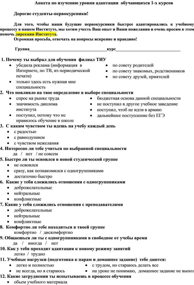 Анкета по изучению уровня адаптации обучающихся 1-х курсов