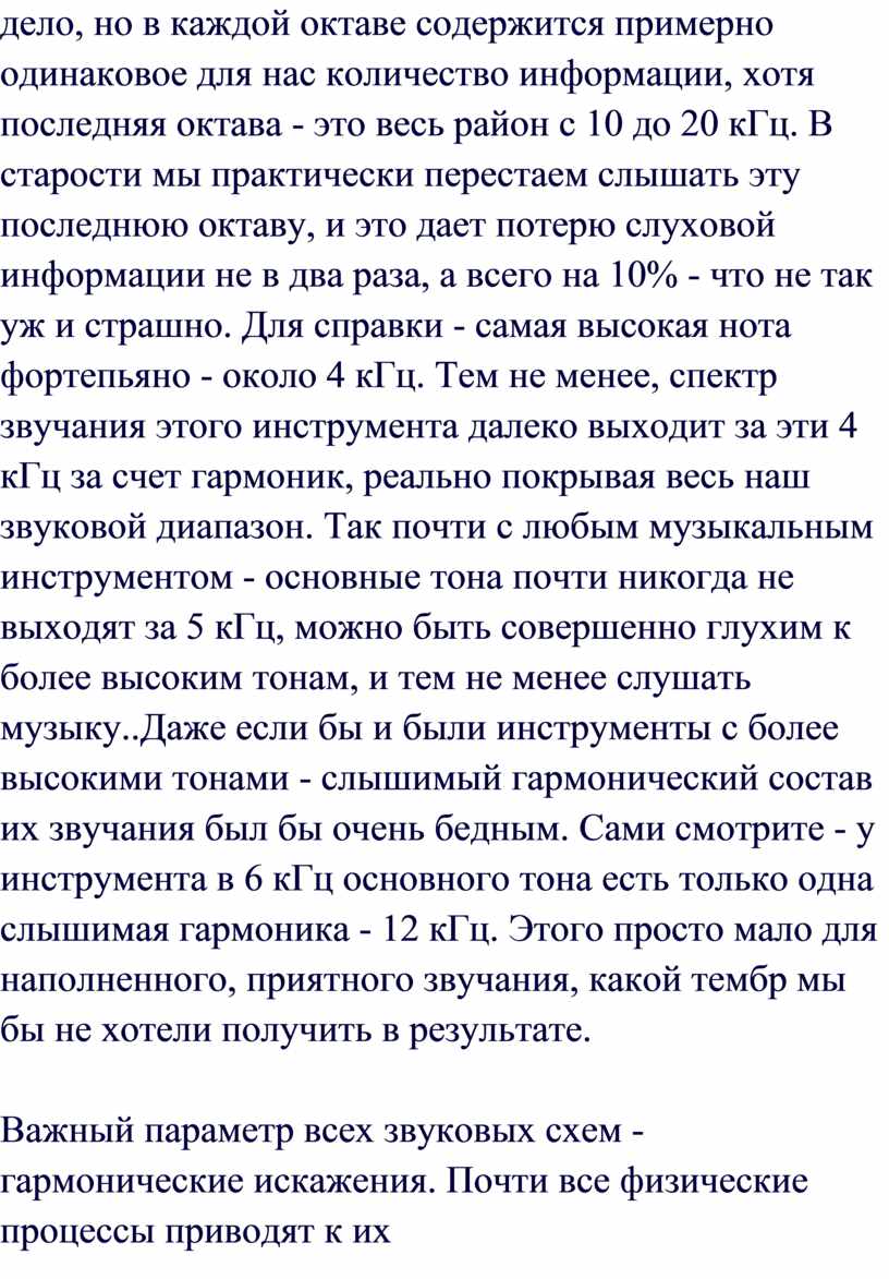 Октава - понятие, полезное не только для музыкантов. Октава в акустике - это изменение частоты звука в два раза. Мы уверенно слышим примерно полных 10 октав, это на две октавы выше, чем последняя октава фортепьяно. Странное дело, но в каждой октаве содержится примерно одинаковое для нас количество информации, хотя последняя октава - это весь район с 10 до 20 кГц. В старости мы практически перестаем слышать эту последнюю октаву, и это дает потерю слуховой информации не в два раза, а всего на 10% - что не так уж и страшно. Для справки - самая высокая нота фортепьяно - около 4 кГц. Тем не менее, спектр звучания этого инструмента далеко выходит за эти 4 кГц за счет гармоник, реально покрывая весь наш звуковой диапазон. Так почти с любым музыкальным инструментом - основные тона почти никогда не выходят за 5 кГц, можно быть совершенно глухим к более высоким тонам, и тем не менее слушать музыку..Даже если бы и были инструменты с более высокими тонами - слышимый гармонический состав их звучания был бы очень бедным. Сами смотрите - у инструмента в 6 кГц основного тона есть только одна слышимая гармоника - 12 кГц. Этого просто мало для наполненного, приятного звучания, какой тембр мы бы не хотели получить в результате.