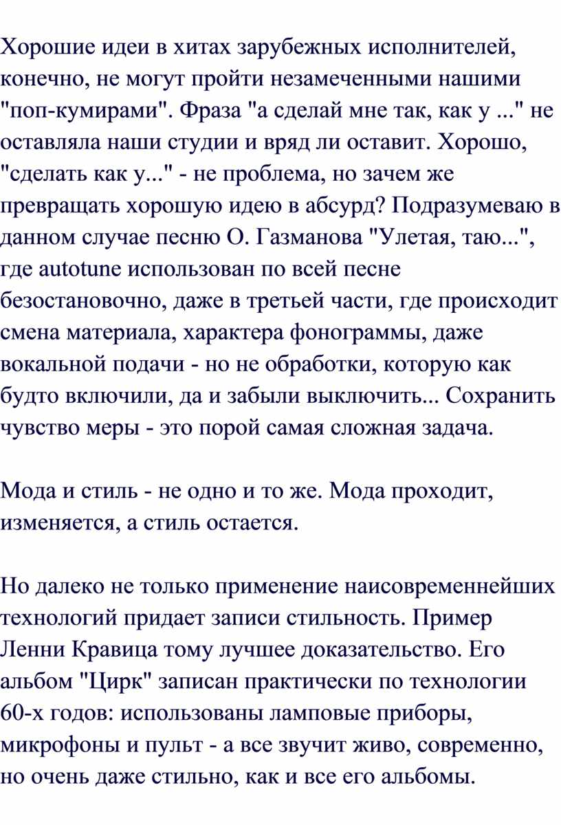 Хорошие идеи в хитах зарубежных исполнителей, конечно, не могут пройти незамеченными нашими "поп-кумирами". Фраза "а сделай мне так, как у ..." не оставляла наши студии и вряд ли оставит. Хорошо, "сделать как у..." - не проблема, но зачем же превращать хорошую идею в абсурд? Подразумеваю в данном случае песню О. Газманова "Улетая, таю...", где autotune использован по всей песне безостановочно, даже в третьей части, где происходит смена материала, характера фонограммы, даже вокальной подачи - но не обработки, которую как будто включили, да и забыли выключить... Сохранить чувство меры - это порой самая сложная задача.