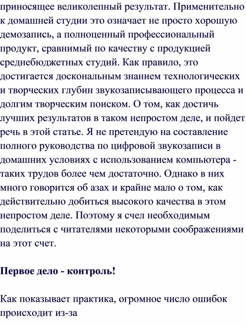 Бурное развитие и удешевление информационных технологий сделали сложнейшие технологические процессы, ранее доступные только избранным, достоянием широкой общественности. Однако это породило некий парадокс - высочайшие вычислительные мощности зачастую соседствуют с полной технической безграмотностью пользователей. Мощнейшие компьютеры, воплотившие в себе многолетний труд теоретиков, инженеров, изобретателей, зачастую служат в качестве печатной машинки и экрана для просмотра плавающих рыбок. Но бывает и обратное, хотя намного реже - грамотное, высокопрофессиональное использование всех ресурсов, приносящее великолепный результат. Применительно к домашней студии это означает не просто хорошую демозапись, а полноценный профессиональный продукт, сравнимый по качеству с продукцией среднебюджетных студий. Как правило, это достигается доскональным знанием технологических и творческих глубин звукозаписывающего процесса и долгим творческим поиском. О том, как достичь лучших результатов в таком непростом деле, и пойдет речь в этой статье. Я не претендую на составление полного руководства по цифровой звукозаписи в домашних условиях с использованием компьютера - таких трудов более чем достаточно. Однако в них много говорится об азах и крайне мало о том, как действительно добиться высокого качества в этом непростом деле. Поэтому я счел необходимым поделиться с читателями некоторыми соображениями на этот счет.