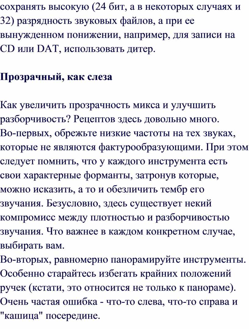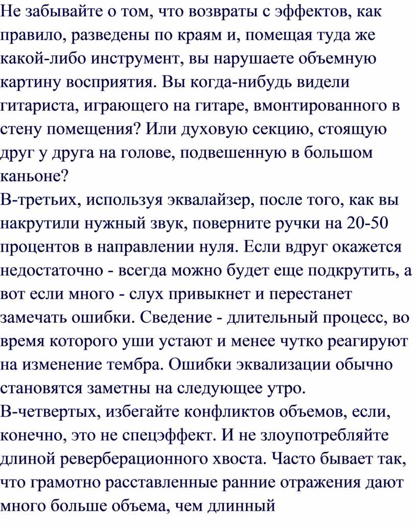 Очень частая ошибка - что-то слева, что-то справа и "кашица" посередине. Не забывайте о том, что возвраты с эффектов, как правило, разведены по краям и, помещая туда же какой-либо инструмент, вы нарушаете объемную картину восприятия. Вы когда-нибудь видели гитариста, играющего на гитаре, вмонтированного в стену помещения? Или духовую секцию, стоящую друг у друга на голове, подвешенную в большом каньоне?