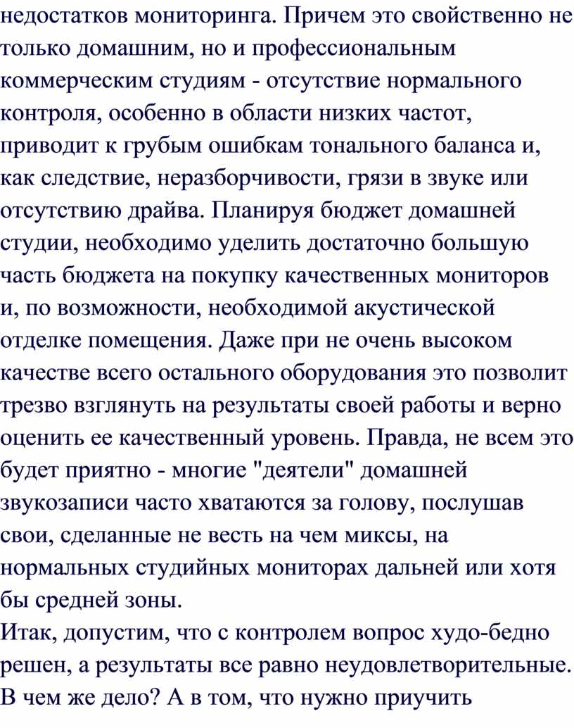 Как показывает практика, огромное число ошибок происходит из-за недостатков мониторинга. Причем это свойственно не только домашним, но и профессиональным коммерческим студиям - отсутствие нормального контроля, особенно в области низких частот, приводит к грубым ошибкам тонального баланса и, как следствие, неразборчивости, грязи в звуке или отсутствию драйва. Планируя бюджет домашней студии, необходимо уделить достаточно большую часть бюджета на покупку качественных мониторов и, по возможности, необходимой акустической отделке помещения. Даже при не очень высоком качестве всего остального оборудования это позволит трезво взглянуть на результаты своей работы и верно оценить ее качественный уровень. Правда, не всем это будет приятно - многие "деятели" домашней звукозаписи часто хватаются за голову, послушав свои, сделанные не весть на чем миксы, на нормальных студийных мониторах дальней или хотя бы средней зоны.