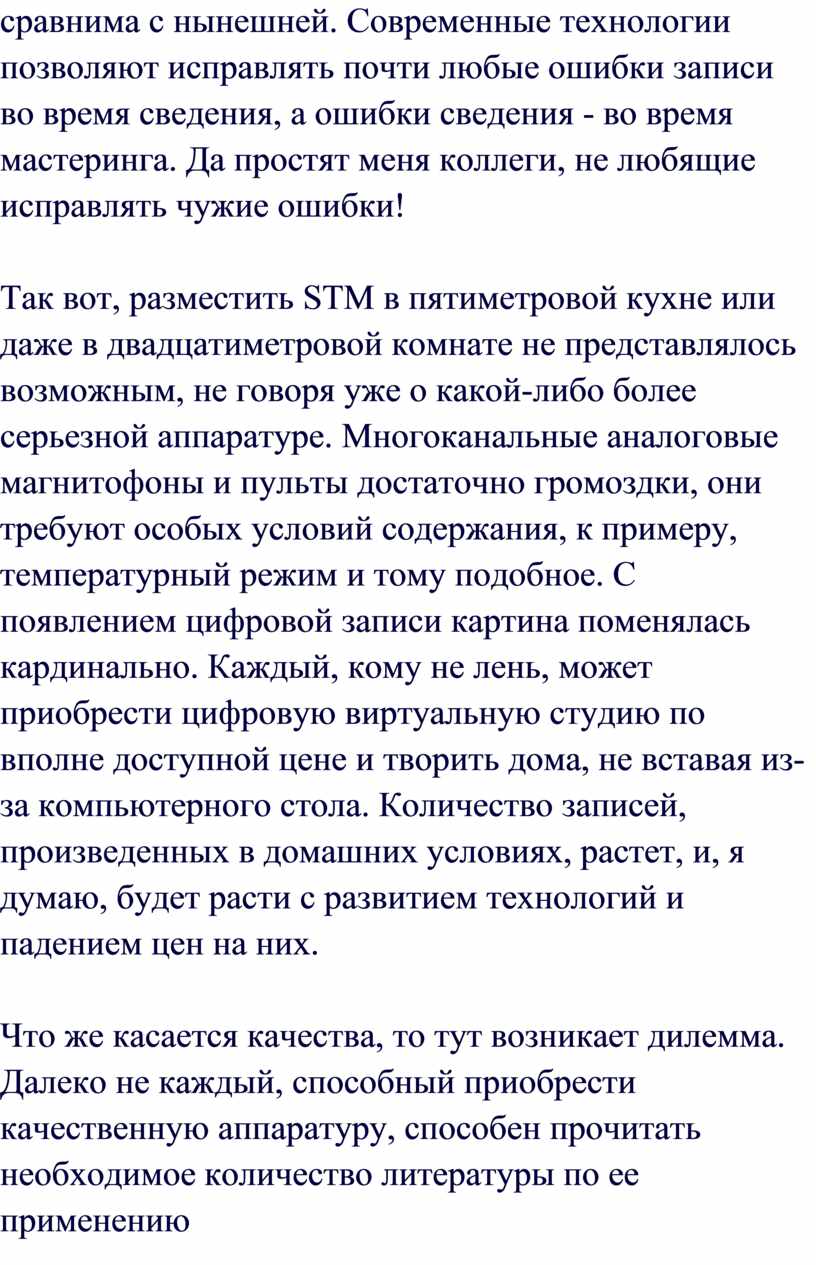 Нынешняя ситуация на рынке музыкальных технологий разительно отличается от той, в которой привыкли жить и работать звукоинженеры и звукорежиссеры старшего поколения. Раньше для записи требовалось определенное количество дорогостоящей аппаратуры, которую можно было разместить только в достаточно большом помещении, причем стационарно, и о возможности все это иметь у себя дома музыкантам и композиторам даже не приходило с голову. Каждая запись, конечно же, являлась праздником для всех причастных к ней людей, при этом степень ответственности за качество просто не сравнима с нынешней. Современные технологии позволяют исправлять почти любые ошибки записи во время сведения, а ошибки сведения - во время мастеринга. Да простят меня коллеги, не любящие исправлять чужие ошибки!
