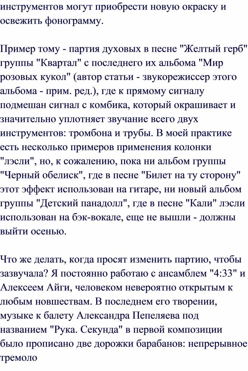 Пример тому - партия духовых в песне "Желтый герб" группы "Квартал" с последнего их альбома "Мир розовых кукол" (автор статьи - звукорежиссер этого альбома - прим. ред.), где к прямому сигналу подмешан сигнал с комбика, который окрашивает и значительно уплотняет звучание всего двух инструментов: тромбона и трубы. В моей практике есть несколько примеров применения колонки "лэсли", но, к сожалению, пока ни альбом группы "Черный обелиск", где в песне "Билет на ту сторону" этот эффект использован на гитаре, ни новый альбом группы "Детский панадолл", где в песне "Кали" лэсли использован на бэк-вокале, еще не вышли - должны выйти осенью.