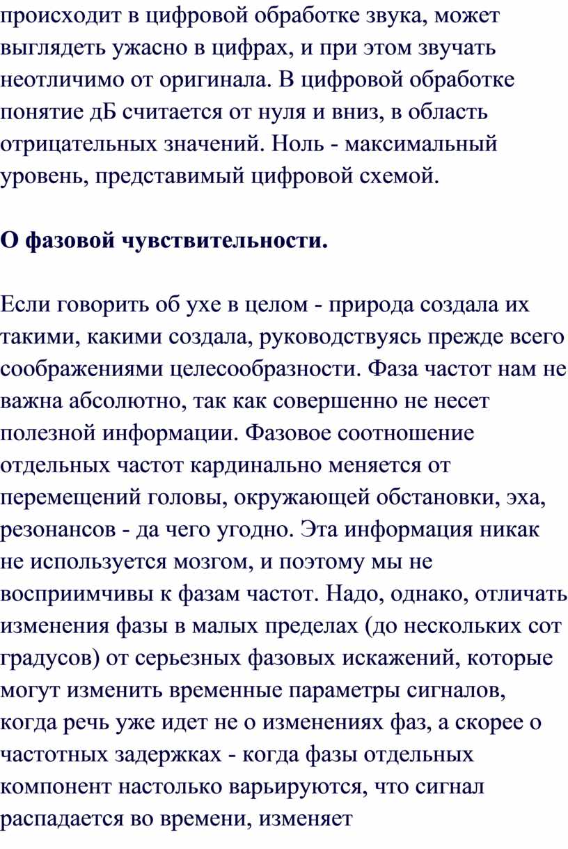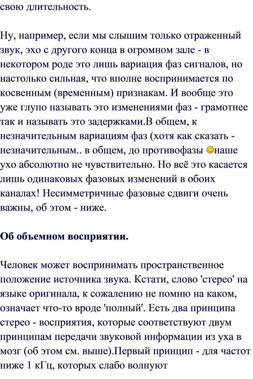 Ну, например, если мы слышим только отраженный звук, эхо с другого конца в огромном зале - в некотором роде это лишь вариация фаз сигналов, но настолько сильная, что вполне воспринимается по косвенным (временным) признакам. И вообще это уже глупо называть это изменениями фаз - грамотнее так и называть это задержками.В общем, к незначительным вариациям фаз (хотя как сказать - незначительным.. в общем, до противофазы http://e-music.fdstar.ru/stpl/fdstar/images/smiles/wink24.gifнаше ухо абсолютно не чувствительно. Но всё это касается лишь одинаковых фазовых изменений в обоих каналах! Несимметричные фазовые сдвиги очень важны, об этом - ниже.