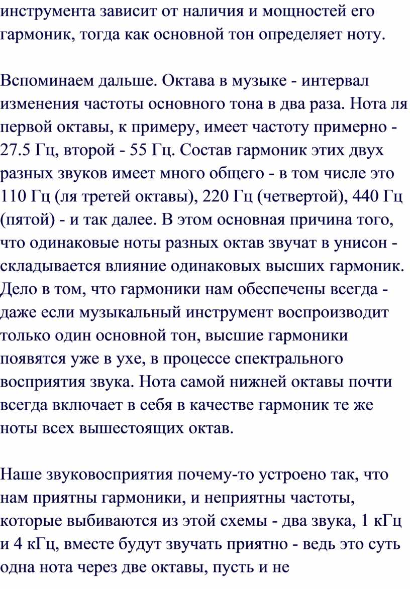 Вспоминаем дальше. Октава в музыке - интервал изменения частоты основного тона в два раза. Нота ля первой октавы, к примеру, имеет частоту примерно - 27.5 Гц, второй - 55 Гц. Состав гармоник этих двух разных звуков имеет много общего - в том числе это 110 Гц (ля третей октавы), 220 Гц (четвертой), 440 Гц (пятой) - и так далее. В этом основная причина того, что одинаковые ноты разных октав звучат в унисон - складывается влияние одинаковых высших гармоник. Дело в том, что гармоники нам обеспечены всегда - даже если музыкальный инструмент воспроизводит только один основной тон, высшие гармоники появятся уже в ухе, в процессе спектрального восприятия звука. Нота самой нижней октавы почти всегда включает в себя в качестве гармоник те же ноты всех вышестоящих октав.