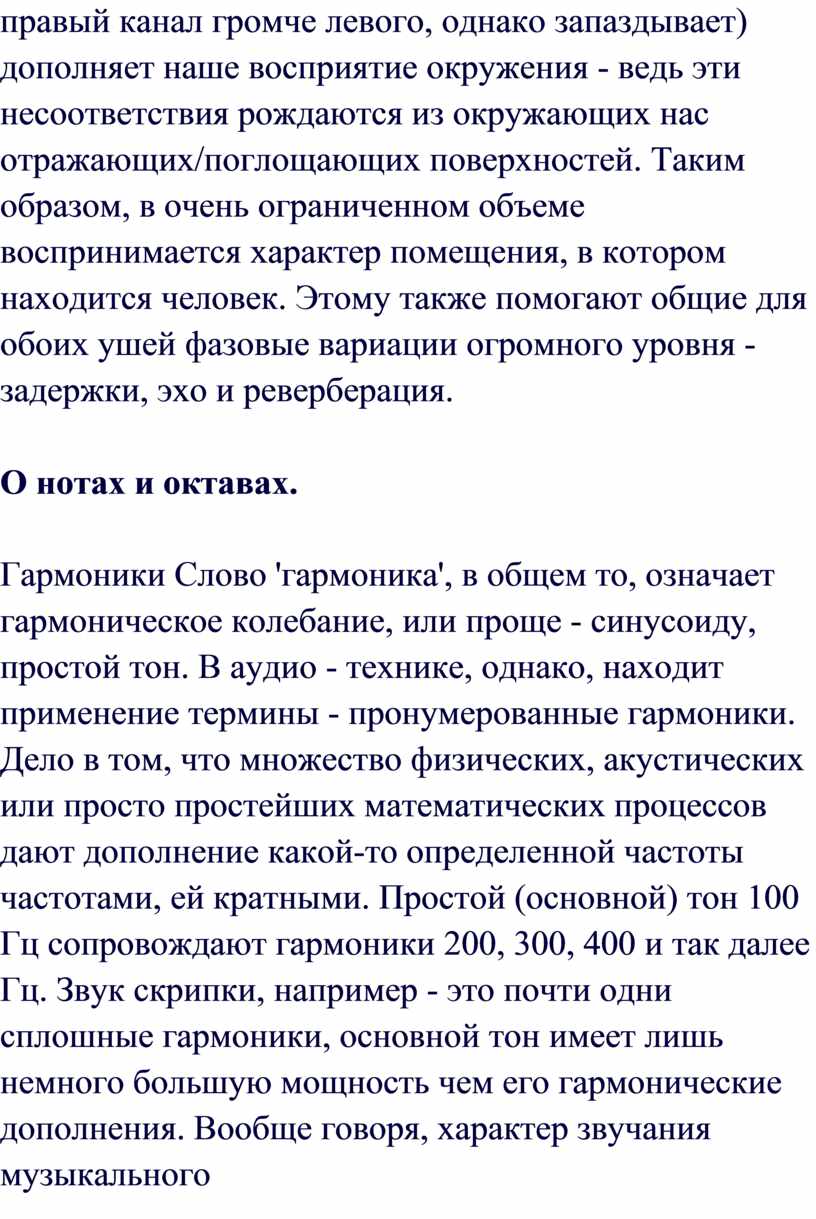 Таким образом, для стерео - восприятия во всех частотах важна громкость правого и левого канала, а в частотах где это возможно, до 1 - 2 кГц, дополнительно оцениваются и относительные фазовые сдвиги. Дополнительная информация - подсознательный поворот головы и мгновенная оценка результатов.Фазовая информация в районе 1 - 4 кГц имеет приоритет над разницей в громкости, хотя определенная разница уровней перекрывает фазовую разницу, и наоборот. Не совсем соответствующие или прямо противоречивые данные (например - правый канал громче левого, однако запаздывает) дополняет наше восприятие окружения - ведь эти несоответствия рождаются из окружающих нас отражающих/поглощающих поверхностей. Таким образом, в очень ограниченном объеме воспринимается характер помещения, в котором находится человек. Этому также помогают общие для обоих ушей фазовые вариации огромного уровня - задержки, эхо и реверберация.