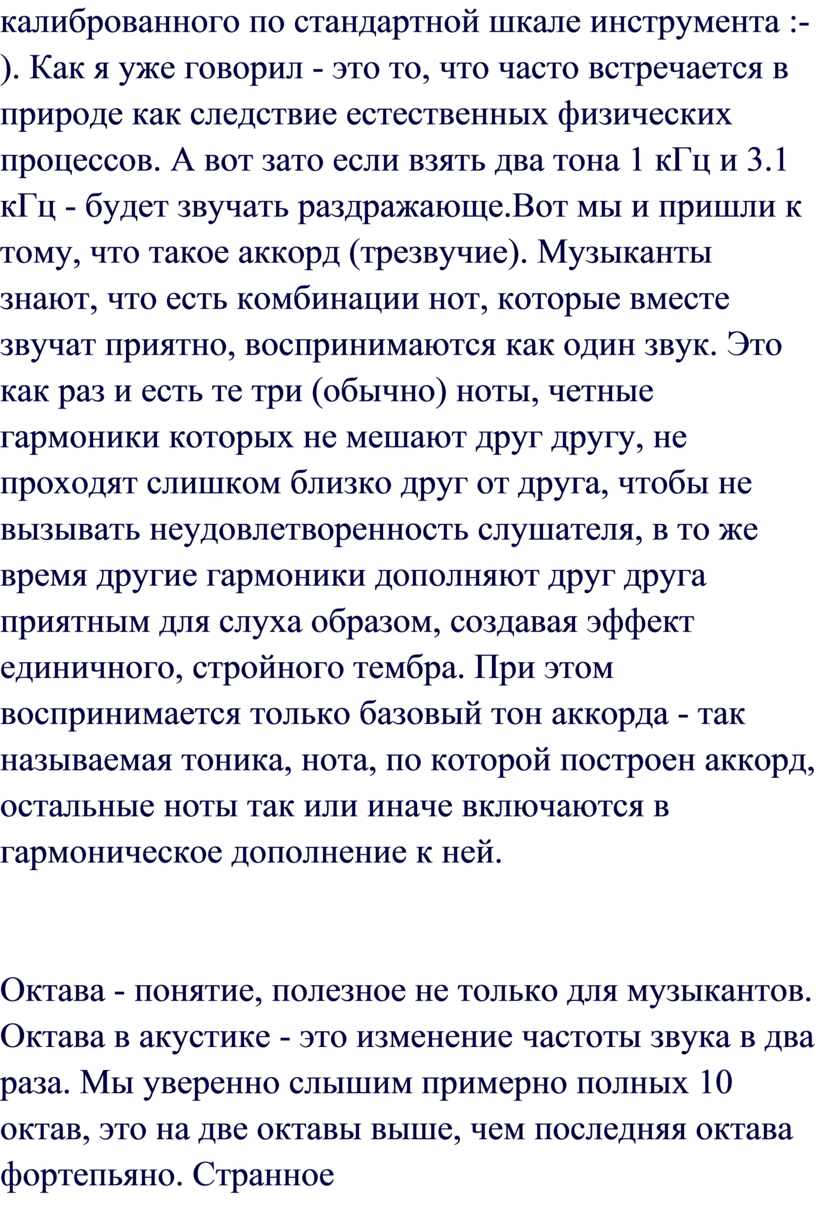 Наше звуковосприятия почему-то устроено так, что нам приятны гармоники, и неприятны частоты, которые выбиваются из этой схемы - два звука, 1 кГц и 4 кГц, вместе будут звучать приятно - ведь это суть одна нота через две октавы, пусть и не калиброванного по стандартной шкале инструмента :-). Как я уже говорил - это то, что часто встречается в природе как следствие естественных физических процессов. А вот зато если взять два тона 1 кГц и 3.1 кГц - будет звучать раздражающе.Вот мы и пришли к тому, что такое аккорд (трезвучие). Музыканты знают, что есть комбинации нот, которые вместе звучат приятно, воспринимаются как один звук. Это как раз и есть те три (обычно) ноты, четные гармоники которых не мешают друг другу, не проходят слишком близко друг от друга, чтобы не вызывать неудовлетворенность слушателя, в то же время другие гармоники дополняют друг друга приятным для слуха образом, создавая эффект единичного, стройного тембра. При этом воспринимается только базовый тон аккорда - так называемая тоника, нота, по которой построен аккорд, остальные ноты так или иначе включаются в гармоническое дополнение к ней.