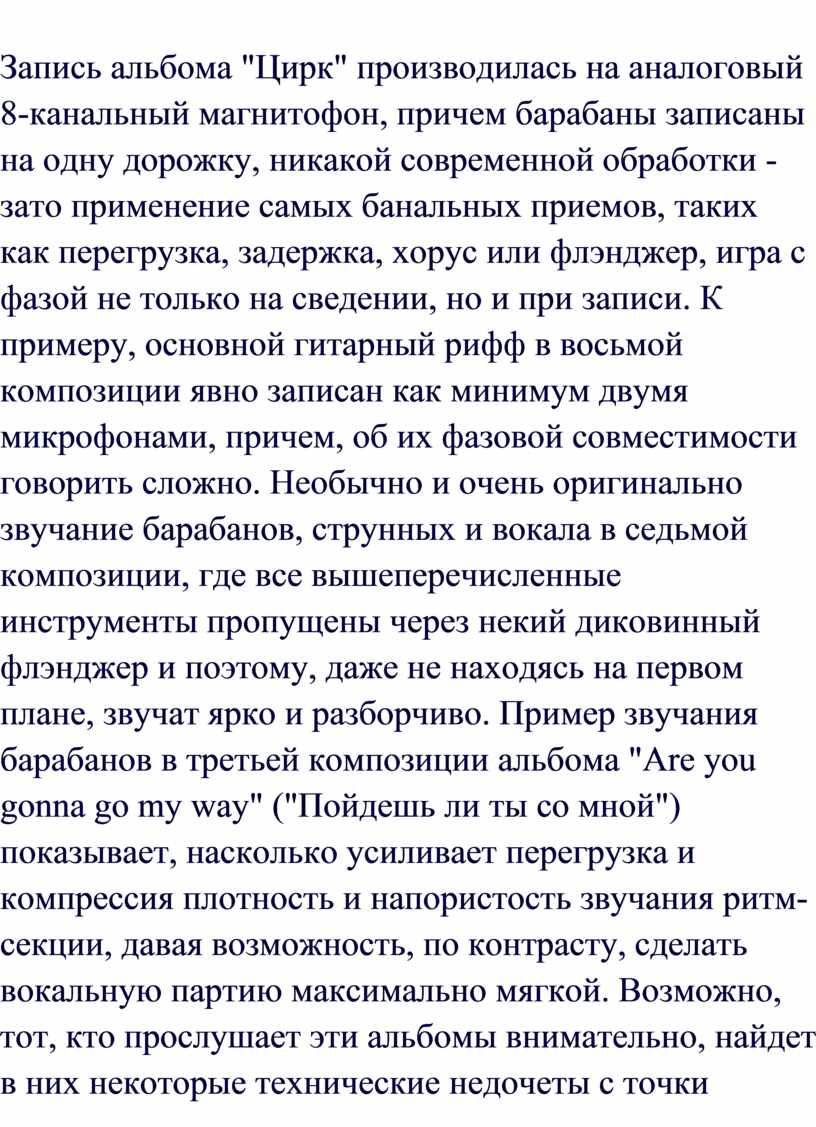Запись альбома "Цирк" производилась на аналоговый 8-канальный магнитофон, причем барабаны записаны на одну дорожку, никакой современной обработки - зато применение самых банальных приемов, таких как перегрузка, задержка, хорус или флэнджер, игра с фазой не только на сведении, но и при записи. К примеру, основной гитарный рифф в восьмой композиции явно записан как минимум двумя микрофонами, причем, об их фазовой совместимости говорить сложно. Необычно и очень оригинально звучание барабанов, струнных и вокала в седьмой композиции, где все вышеперечисленные инструменты пропущены через некий диковинный флэнджер и поэтому, даже не находясь на первом плане, звучат ярко и разборчиво. Пример звучания барабанов в третьей композиции альбома "Are you gonna go my way" ("Пойдешь ли ты со мной") показывает, насколько усиливает перегрузка и компрессия плотность и напористость звучания ритм-секции, давая возможность, по контрасту, сделать вокальную партию максимально мягкой. Возможно, тот, кто прослушает эти альбомы внимательно, найдет в них некоторые технические недочеты с точки зрения стандартов звукозаписи, но в подавляющем большинстве все эти "нестандартности" и "непричесанности" работают на создание яркого эмоционального образа, без которого не могло бы быть "дикого и нежного" Ленни.