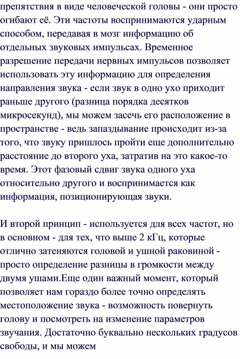 Человек может воспринимать пространственное положение источника звука. Кстати, слово 'стерео' на языке оригинала, к сожалению не помню на каком, означает что-то вроде 'полный'. Есть два принципа стерео - восприятия, которые соответствуют двум принципам передачи звуковой информации из уха в мозг (об этом см. выше).Первый принцип - для частот ниже 1 кГц, которых слабо волнуют препятствия в виде человеческой головы - они просто огибают её. Эти частоты воспринимаются ударным способом, передавая в мозг информацию об отдельных звуковых импульсах. Временное разрешение передачи нервных импульсов позволяет использовать эту информацию для определения направления звука - если звук в одно ухо приходит раньше другого (разница порядка десятков микросекунд), мы можем засечь его расположение в пространстве - ведь запаздывание происходит из-за того, что звуку пришлось пройти еще дополнительно расстояние до второго уха, затратив на это какое-то время. Этот фазовый сдвиг звука одного уха относительно другого и воспринимается как информация, позиционирующая звуки.