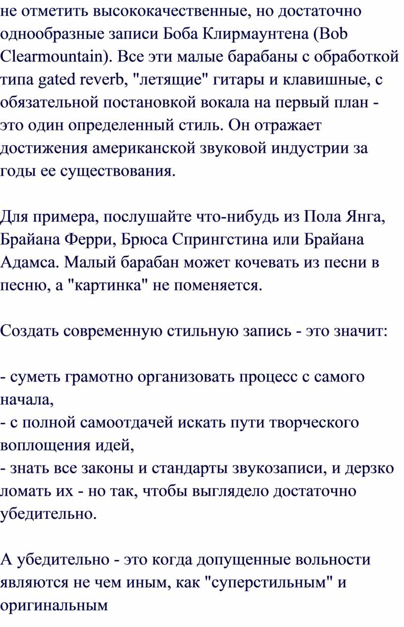 Нестандартность подходов к решению задач звукозаписи - это стильно, но не могу не отметить высококачественные, но достаточно однообразные записи Боба Клирмаунтена (Bob Clearmountain). Все эти малые барабаны с обработкой типа gated reverb, "летящие" гитары и клавишные, с обязательной постановкой вокала на первый план - это один определенный стиль. Он отражает достижения американской звуковой индустрии за годы ее существования.