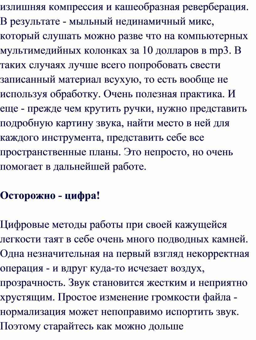 "Да у меня в компьютере столько всяких эффектов - наверну, что хошь!" - очень распространенное мнение среди начинающих. И наворачивают, накручивают так, что уши вянут. А потом удивляются, что плоховато звучит в виртуальном варианте (наверное, обработок мало, "надо апгрейд сделать, чтоб плагинов побольше тянуло". Наиболее частые ошибки - чрезмерная эквализация, излишняя компрессия и кашеобразная реверберация. В результате - мыльный нединамичный микс, который слушать можно разве что на компьютерных мультимедийных колонках за 10 долларов в mp3. В таких случаях лучше всего попробовать свести записанный материал всухую, то есть вообще не используя обработку. Очень полезная практика. И еще - прежде чем крутить ручки, нужно представить подробную картину звука, найти место в ней для каждого инструмента, представить себе все пространственные планы. Это непросто, но очень помогает в дальнейшей работе.