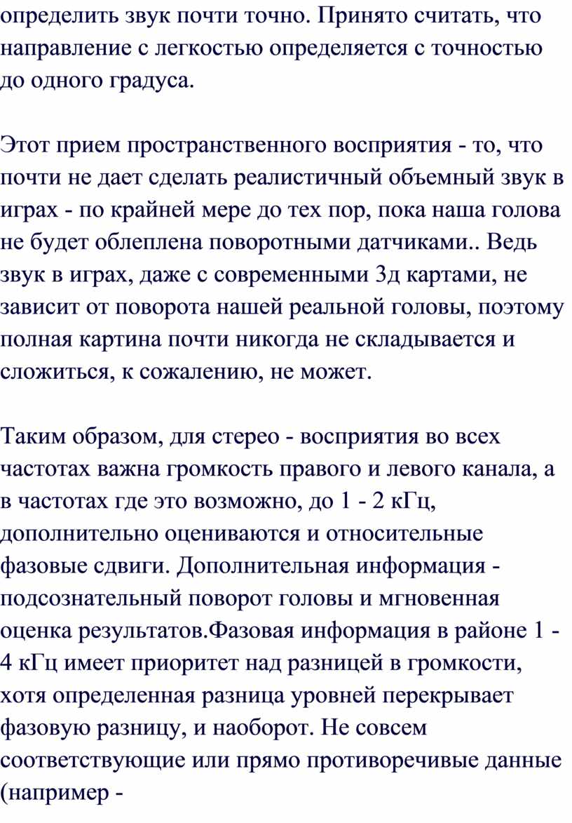 Этот прием пространственного восприятия - то, что почти не дает сделать реалистичный объемный звук в играх - по крайней мере до тех пор, пока наша голова не будет облеплена поворотными датчиками.. Ведь звук в играх, даже с современными 3д картами, не зависит от поворота нашей реальной головы, поэтому полная картина почти никогда не складывается и сложиться, к сожалению, не может.