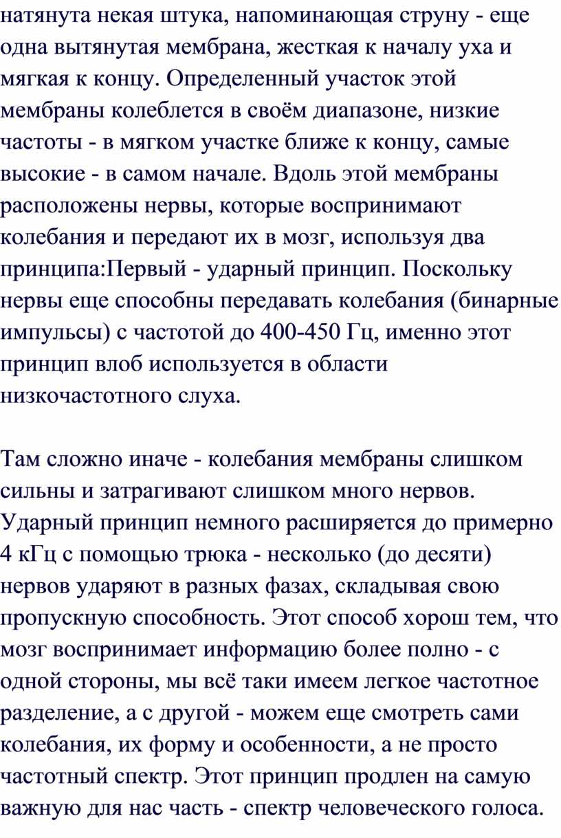 Во внутреннем ухе по всей его длине натянута некая штука, напоминающая струну - еще одна вытянутая мембрана, жесткая к началу уха и мягкая к концу. Определенный участок этой мембраны колеблется в своём диапазоне, низкие частоты - в мягком участке ближе к концу, самые высокие - в самом начале. Вдоль этой мембраны расположены нервы, которые воспринимают колебания и передают их в мозг, используя два принципа:Первый - ударный принцип. Поскольку нервы еще способны передавать колебания (бинарные импульсы) с частотой до 400-450 Гц, именно этот принцип влоб используется в области низкочастотного слуха.