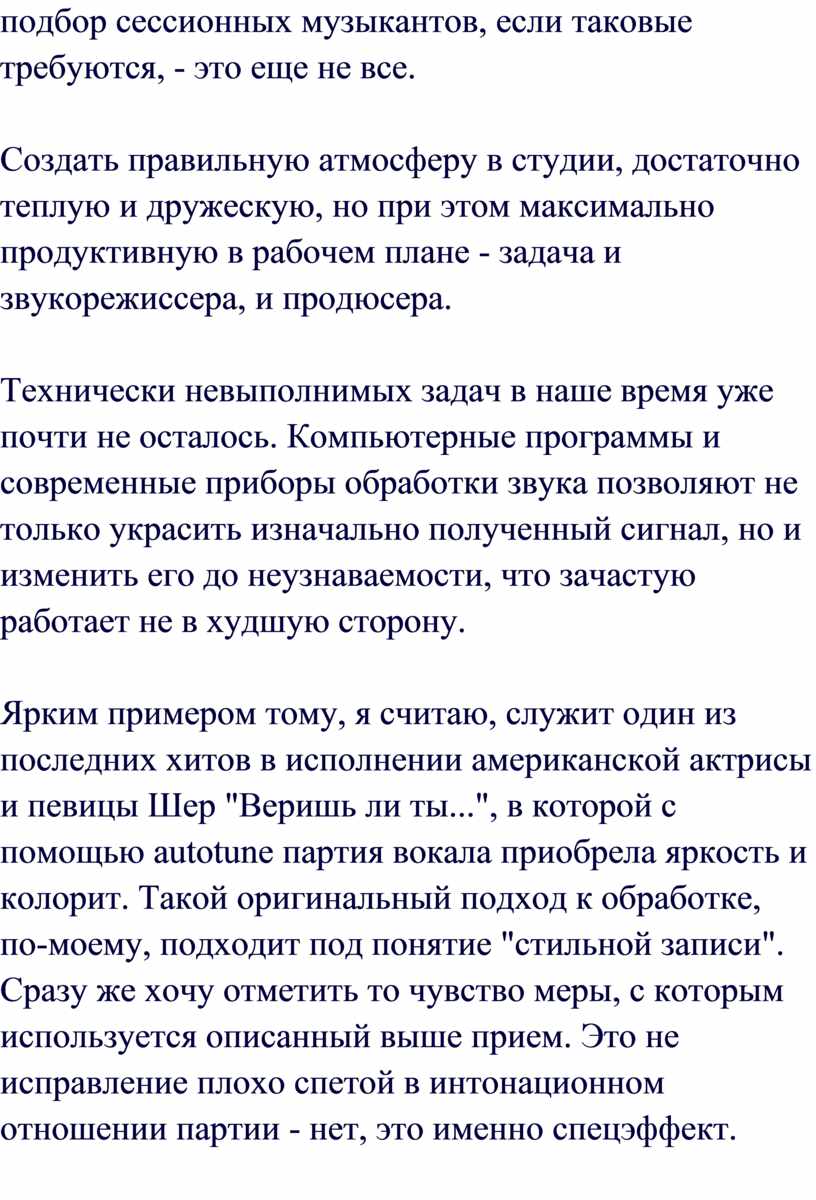 Ярким примером тому, я считаю, служит один из последних хитов в исполнении американской актрисы и певицы Шер "Веришь ли ты...", в которой с помощью autotune партия вокала приобрела яркость и колорит. Такой оригинальный подход к обработке, по-моему, подходит под понятие "стильной записи". Сразу же хочу отметить то чувство меры, с которым используется описанный выше прием. Это не исправление плохо спетой в интонационном отношении партии - нет, это именно спецэффект.