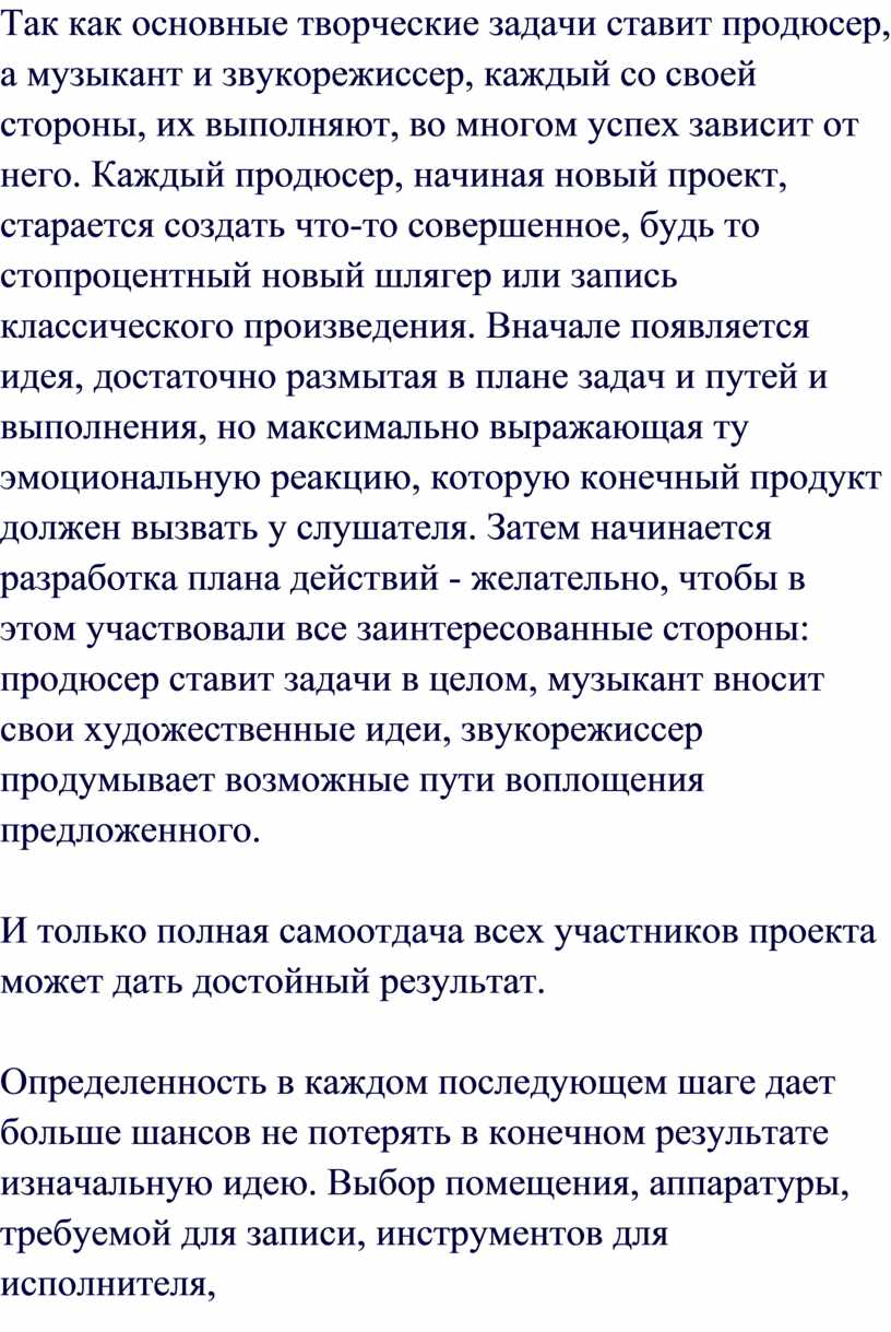 Так как основные творческие задачи ставит продюсер, а музыкант и звукорежиссер, каждый со своей стороны, их выполняют, во многом успех зависит от него. Каждый продюсер, начиная новый проект, старается создать что-то совершенное, будь то стопроцентный новый шлягер или запись классического произведения. Вначале появляется идея, достаточно размытая в плане задач и путей и выполнения, но максимально выражающая ту эмоциональную реакцию, которую конечный продукт должен вызвать у слушателя. Затем начинается разработка плана действий - желательно, чтобы в этом участвовали все заинтересованные стороны: продюсер ставит задачи в целом, музыкант вносит свои художественные идеи, звукорежиссер продумывает возможные пути воплощения предложенного.