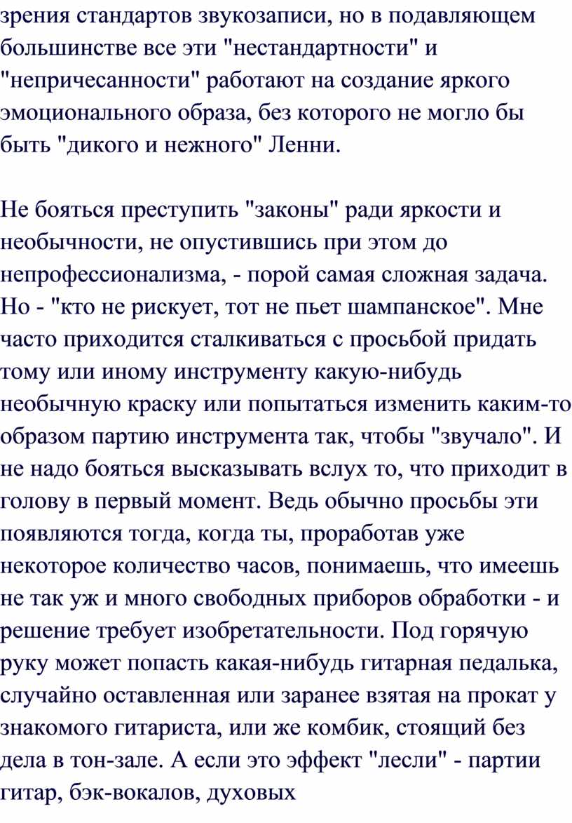 Не бояться преступить "законы" ради яркости и необычности, не опустившись при этом до непрофессионализма, - порой самая сложная задача. Но - "кто не рискует, тот не пьет шампанское". Мне часто приходится сталкиваться с просьбой придать тому или иному инструменту какую-нибудь необычную краску или попытаться изменить каким-то образом партию инструмента так, чтобы "звучало". И не надо бояться высказывать вслух то, что приходит в голову в первый момент. Ведь обычно просьбы эти появляются тогда, когда ты, проработав уже некоторое количество часов, понимаешь, что имеешь не так уж и много свободных приборов обработки - и решение требует изобретательности. Под горячую руку может попасть какая-нибудь гитарная педалька, случайно оставленная или заранее взятая на прокат у знакомого гитариста, или же комбик, стоящий без дела в тон-зале. А если это эффект "лесли" - партии гитар, бэк-вокалов, духовых инструментов могут приобрести новую окраску и освежить фонограмму.