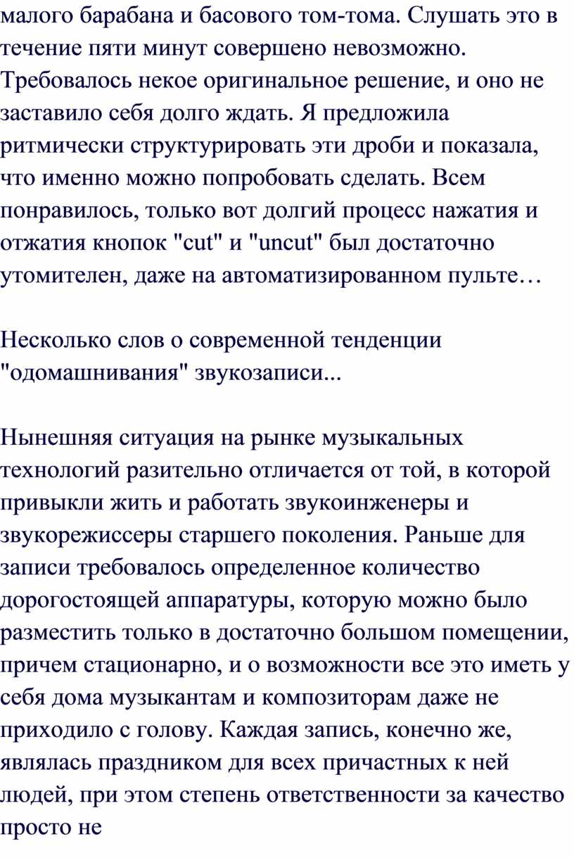 Что же делать, когда просят изменить партию, чтобы зазвучала? Я постоянно работаю с ансамблем "4:33" и Алексеем Айги, человеком невероятно открытым к любым новшествам. В последнем его творении, музыке к балету Александра Пепеляева под названием "Рука. Секунда" в первой композиции было прописано две дорожки барабанов: непрерывное тремоло малого барабана и басового том-тома. Слушать это в течение пяти минут совершено невозможно. Требовалось некое оригинальное решение, и оно не заставило себя долго ждать. Я предложила ритмически структурировать эти дроби и показала, что именно можно попробовать сделать. Всем понравилось, только вот долгий процесс нажатия и отжатия кнопок "cut" и "uncut" был достаточно утомителен, даже на автоматизированном пульте…