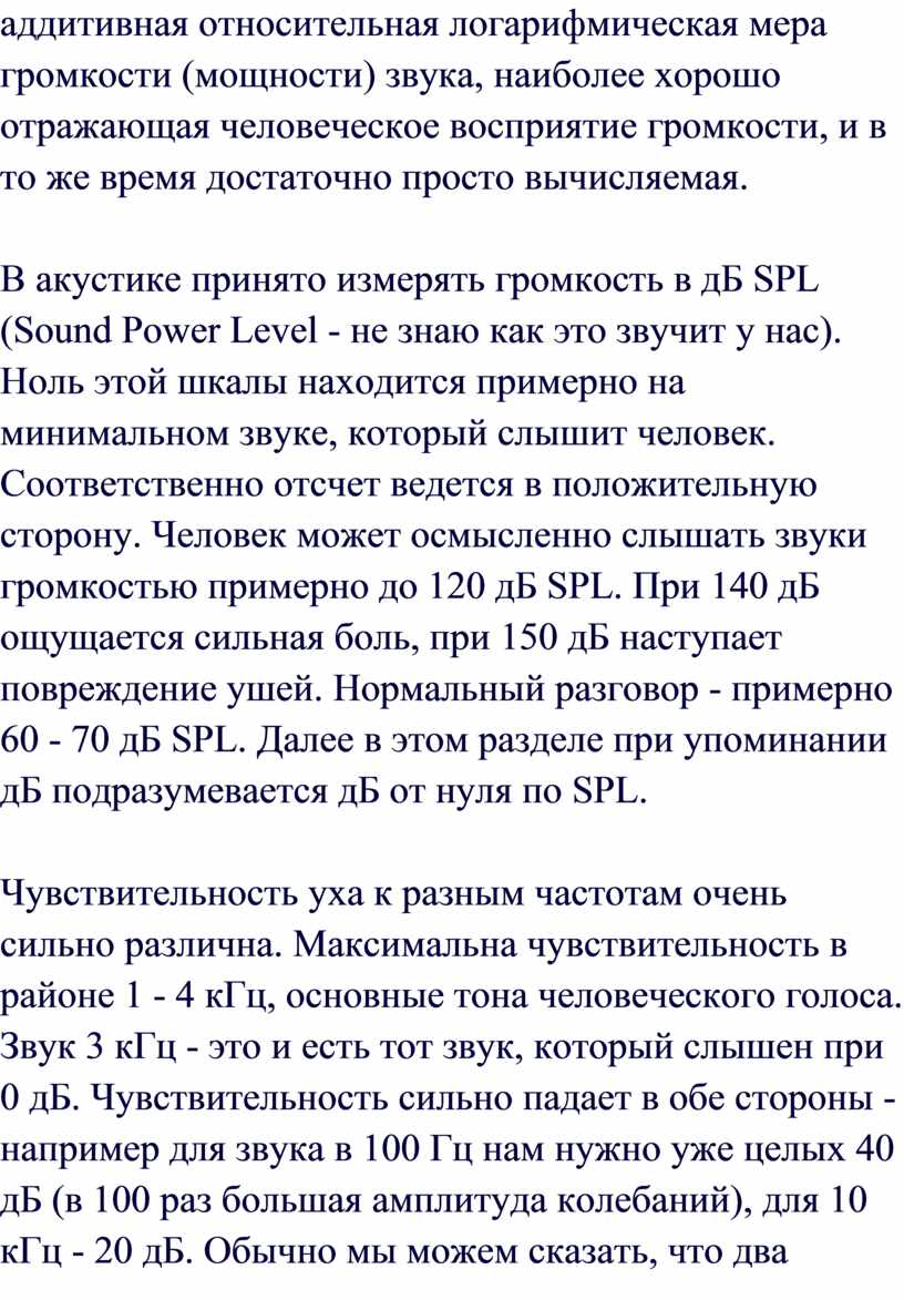 В акустике принято измерять громкость в дБ SPL (Sound Power Level - не знаю как это звучит у нас). Ноль этой шкалы находится примерно на минимальном звуке, который слышит человек. Соответственно отсчет ведется в положительную сторону. Человек может осмысленно слышать звуки громкостью примерно до 120 дБ SPL. При 140 дБ ощущается сильная боль, при 150 дБ наступает повреждение ушей. Нормальный разговор - примерно 60 - 70 дБ SPL. Далее в этом разделе при упоминании дБ подразумевается дБ от нуля по SPL.