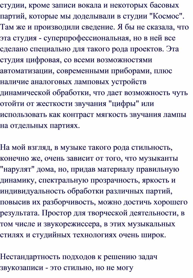 На мой взгляд, в музыке такого рода стильность, конечно же, очень зависит от того, что музыканты "нарулят" дома, но, придав материалу правильную динамику, спектральную прозрачность, яркость и индивидуальность обработки различных партий, повысив их разборчивость, можно достичь хорошего результата. Простор для творческой деятельности, в том числе и звукорежиссера, в этих музыкальных стилях и студийных технологиях очень широк.