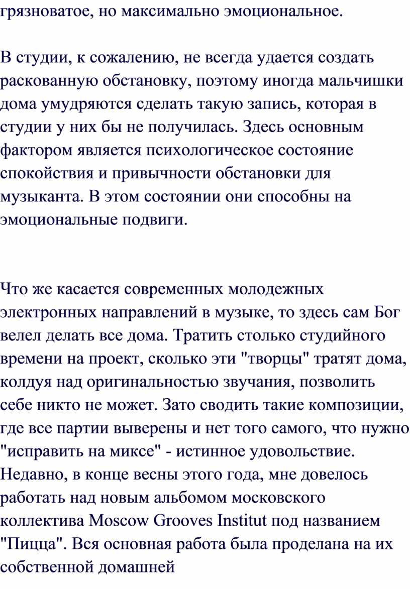 Что же касается современных молодежных электронных направлений в музыке, то здесь сам Бог велел делать все дома. Тратить столько студийного времени на проект, сколько эти "творцы" тратят дома, колдуя над оригинальностью звучания, позволить себе никто не может. Зато сводить такие композиции, где все партии выверены и нет того самого, что нужно "исправить на миксе" - истинное удовольствие. Недавно, в конце весны этого года, мне довелось работать над новым альбомом московского коллектива Moscow Grooves Institut под названием "Пицца". Вся основная работа была проделана на их собственной домашней студии, кроме записи вокала и некоторых басовых партий, которые мы доделывали в студии "Космос". Там же и производили сведение. Я бы не сказала, что эта студия - суперпрофессиональная, но в ней все сделано специально для такого рода проектов. Эта студия цифровая, со всеми возможностями автоматизации, современными приборами, плюс наличие аналоговых ламповых устройств динамической обработки, что дает возможность чуть отойти от жесткости звучания "цифры" или использовать как контраст мягкость звучания лампы на отдельных партиях.