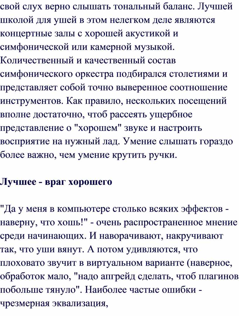 Итак, допустим, что с контролем вопрос худо-бедно решен, а результаты все равно неудовлетворительные. В чем же дело? А в том, что нужно приучить свой слух верно слышать тональный баланс. Лучшей школой для ушей в этом нелегком деле являются концертные залы с хорошей акустикой и симфонической или камерной музыкой. Количественный и качественный состав симфонического оркестра подбирался столетиями и представляет собой точно выверенное соотношение инструментов. Как правило, нескольких посещений вполне достаточно, чтоб рассеять ущербное представление о "хорошем" звуке и настроить восприятие на нужный лад. Умение слышать гораздо более важно, чем умение крутить ручки.