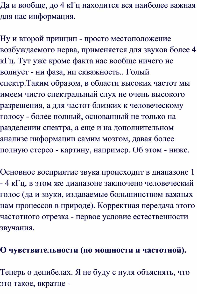 Ну и второй принцип - просто местоположение возбуждаемого нерва, применяется для звуков более 4 кГц. Тут уже кроме факта нас вообще ничего не волнует - ни фаза, ни скважность.. Голый спектр.Таким образом, в области высоких частот мы имеем чисто спектральный слух не очень высокого разрешения, а для частот близких к человеческому голосу - более полный, основанный не только на разделении спектра, а еще и на дополнительном анализе информации самим мозгом, давая более полную стерео - картину, например. Об этом - ниже.