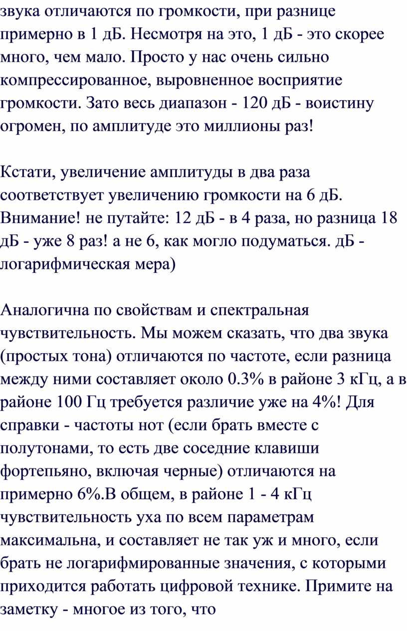 Кстати, увеличение амплитуды в два раза соответствует увеличению громкости на 6 дБ. Внимание! не путайте: 12 дБ - в 4 раза, но разница 18 дБ - уже 8 раз! а не 6, как могло подуматься. дБ - логарифмическая мера)
