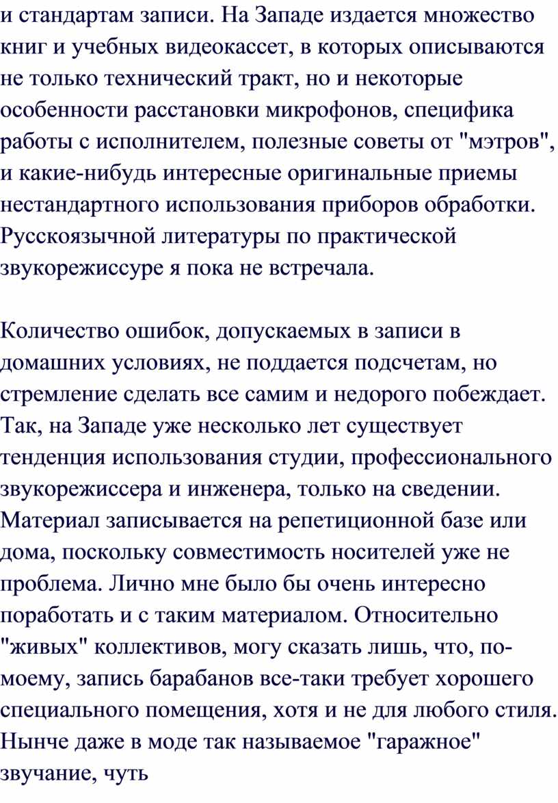 Что же касается качества, то тут возникает дилемма. Далеко не каждый, способный приобрести качественную аппаратуру, способен прочитать необходимое количество литературы по ее применению и стандартам записи. На Западе издается множество книг и учебных видеокассет, в которых описываются не только технический тракт, но и некоторые особенности расстановки микрофонов, специфика работы с исполнителем, полезные советы от "мэтров", и какие-нибудь интересные оригинальные приемы нестандартного использования приборов обработки. Русскоязычной литературы по практической звукорежиссуре я пока не встречала.