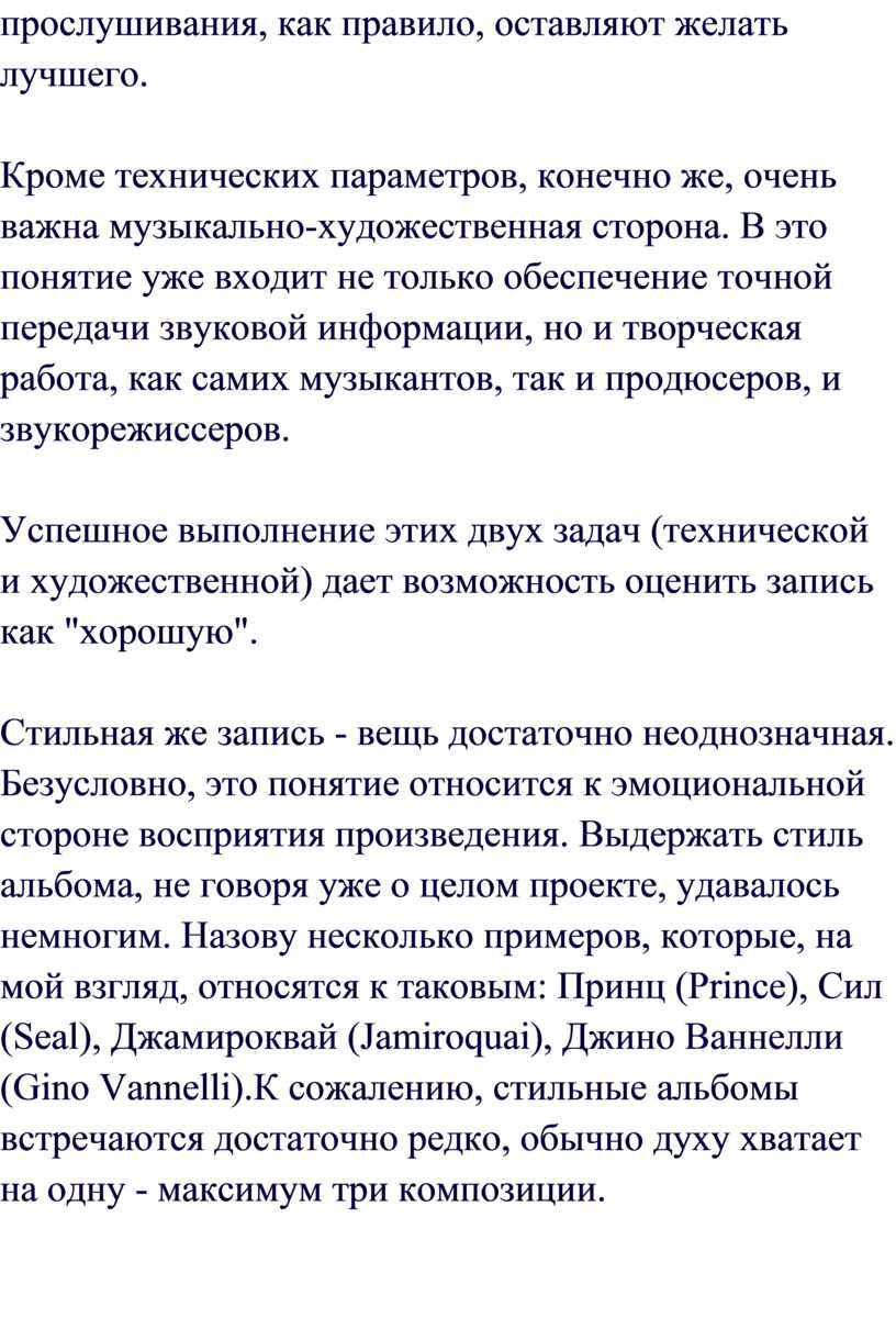 Стильная же запись - вещь достаточно неоднозначная. Безусловно, это понятие относится к эмоциональной стороне восприятия произведения. Выдержать стиль альбома, не говоря уже о целом проекте, удавалось немногим. Назову несколько примеров, которые, на мой взгляд, относятся к таковым: Принц (Prince), Сил (Seal), Джамироквай (Jamiroquai), Джино Ваннелли (Gino Vannelli).К сожалению, стильные альбомы встречаются достаточно редко, обычно духу хватает на одну - максимум три композиции.