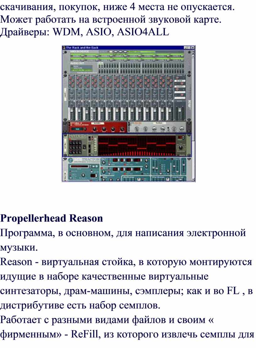 Reason - виртуальная стойка, в которую монтируются идущие в наборе качественные виртуальные синтезаторы, драм-машины, сэмплеры; как и во FL , в дистрибутиве есть набор семплов.