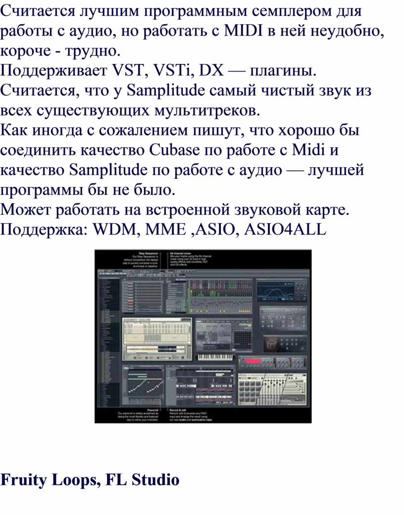 • В Cubase, Nuendo, Sonar входящих в комплект плагинов VST и VSTi не достаточно и их нужно ставить самостоятельно. Во Fruity Loops в комплекте большой набор собственных плагинов программы и плагинов формата VST (VSTi).