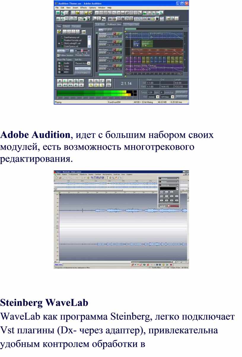 WaveLab как программа Steinberg, легко подключает Vst плагины (Dx- через адаптер), привлекательна удобным контролем обработки в реальном времени, хороша для пакетной обработки файлов