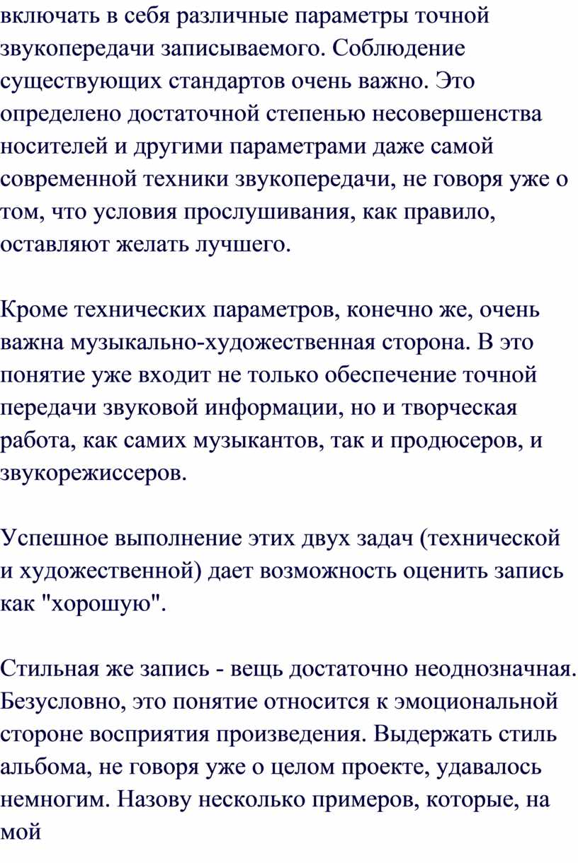 Кроме технических параметров, конечно же, очень важна музыкально-художественная сторона. В это понятие уже входит не только обеспечение точной передачи звуковой информации, но и творческая работа, как самих музыкантов, так и продюсеров, и звукорежиссеров.
