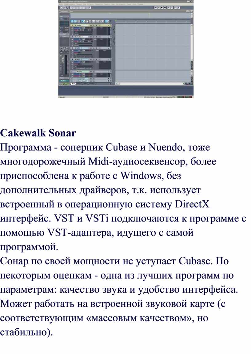 Сонар по своей мощности не уступает Cubase. По некоторым оценкам - одна из лучших программ по параметрам: качество звука и удобство интерфейса.