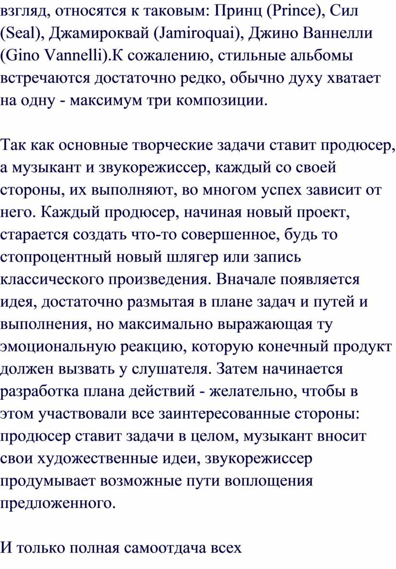 Стильная же запись - вещь достаточно неоднозначная. Безусловно, это понятие относится к эмоциональной стороне восприятия произведения. Выдержать стиль альбома, не говоря уже о целом проекте, удавалось немногим. Назову несколько примеров, которые, на мой взгляд, относятся к таковым: Принц (Prince), Сил (Seal), Джамироквай (Jamiroquai), Джино Ваннелли (Gino Vannelli).К сожалению, стильные альбомы встречаются достаточно редко, обычно духу хватает на одну - максимум три композиции.