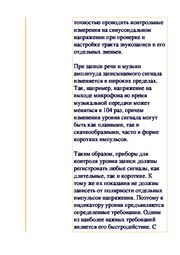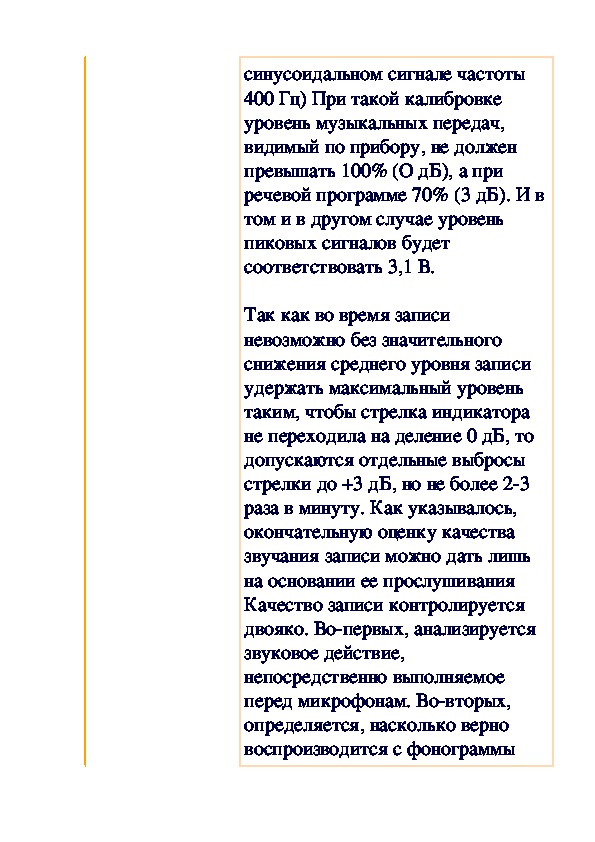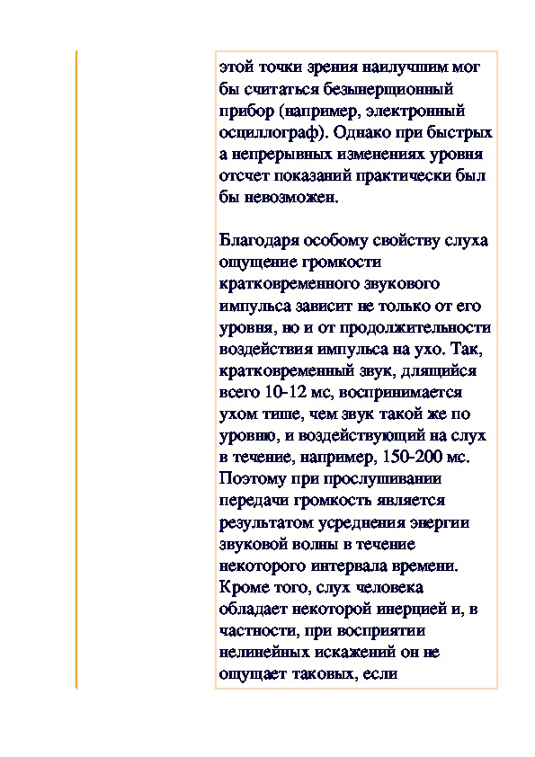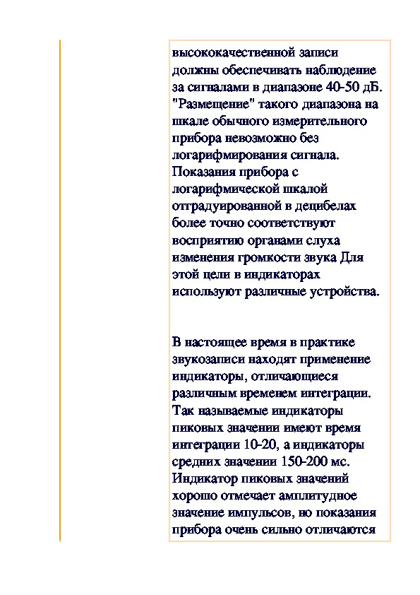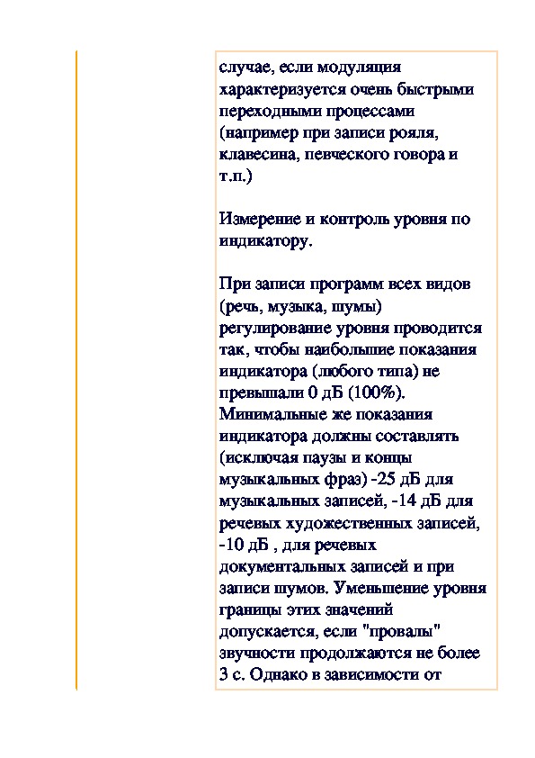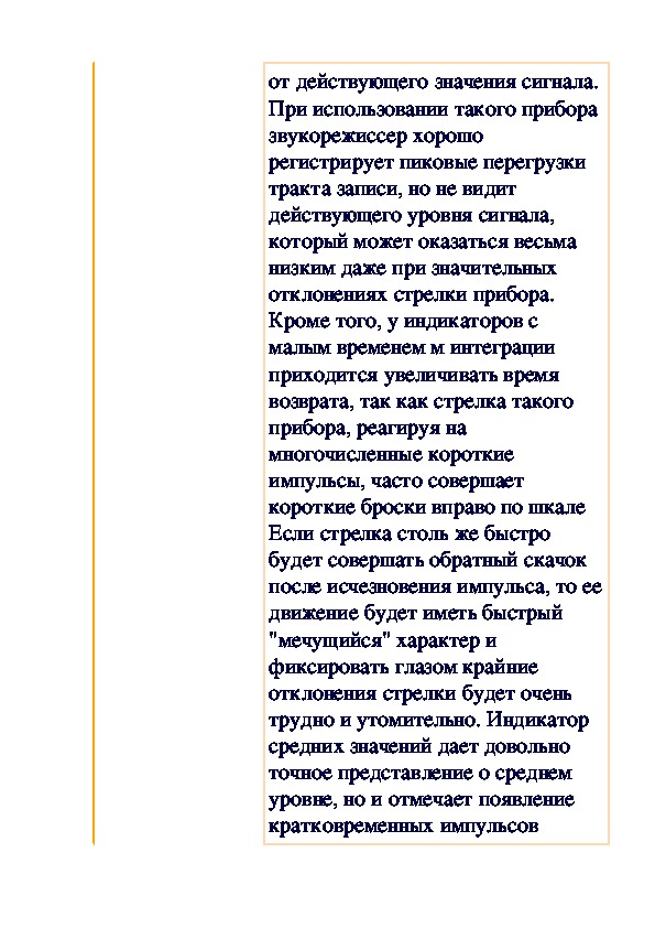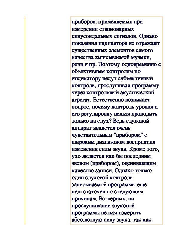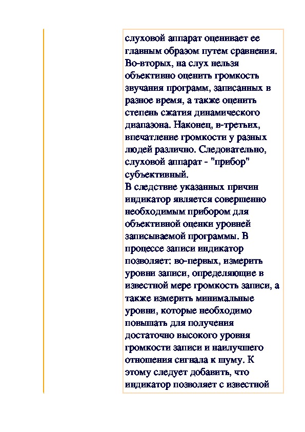 Объективный контроль уровня записываемой программы осуществляется звукорежиссером с помощью специальных измерительных приборов, так называемых индикаторов уровня. Индикаторами или указателями такие приборы названы потому, что при измерении уровней быстроменяющихся сигналов не требуется особо высокая точность, как от обычных измерительных приборов, применяемых при измерении стационарных синусоидальных сигналов. Однако показания индикатора не отражают существенных элементов самого качества записываемой музыки, речи и пр. Поэтому одновременно с объективным контролем по индикатору ведут субъективный контроль, прослушивая программу через контрольный акустический агрегат. Естественно возникает вопрос, почему контроль уровня и его регулировку нельзя проводить только на слух? Ведь слуховой аппарат является очень чувствительным "прибором" с широким диапазоном восприятия изменения силы звука. Кроме того, ухо является как бы последним звеном (прибором), оценивающим качество записи. Однако только один слуховой контроль записываемой программы еще недостаточен по следующим причинам. Во-первых, ни прослушивании звуковой программы нельзя измерить абсолютную силу звука, так как слуховой аппарат оценивает ее главным образом путем сравнения.