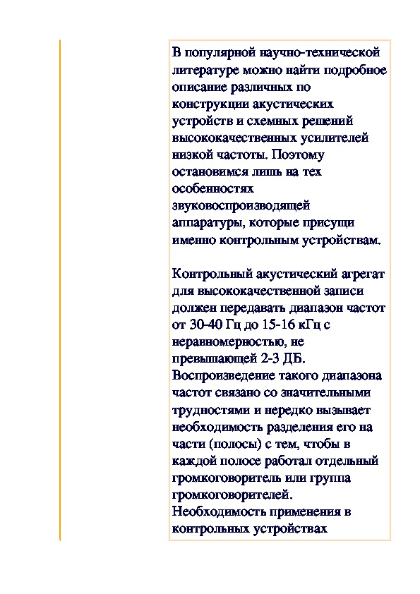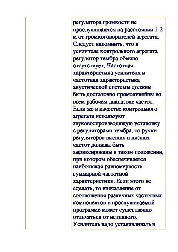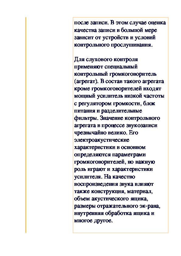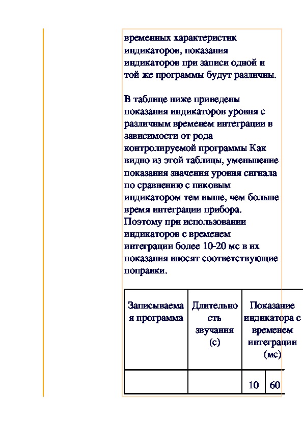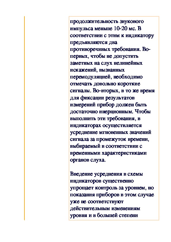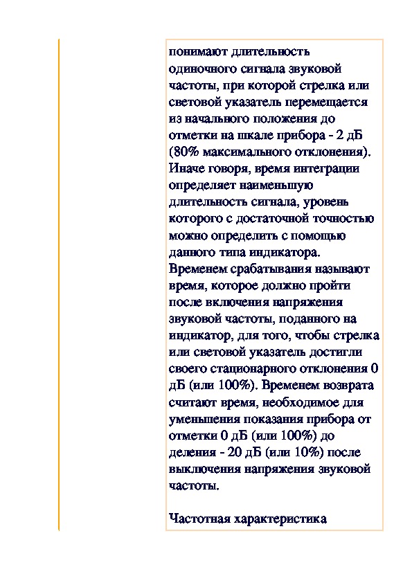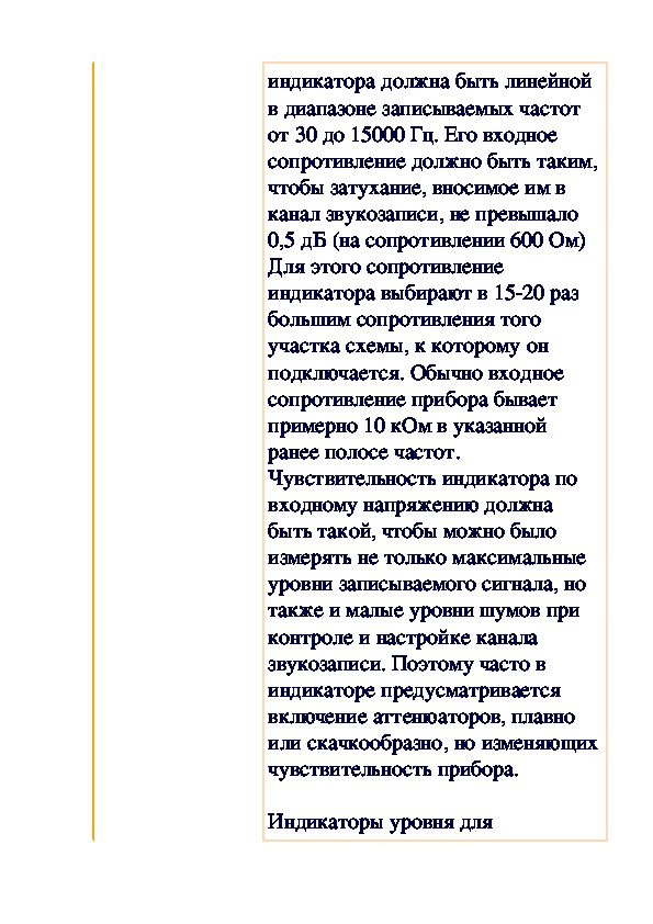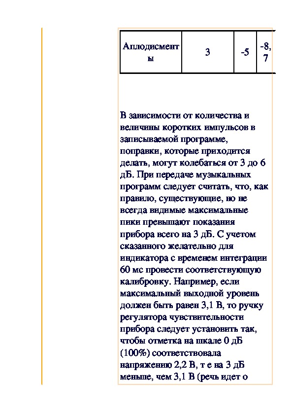 Объективный контроль уровня записываемой программы осуществляется звукорежиссером с помощью специальных измерительных приборов, так называемых индикаторов уровня. Индикаторами или указателями такие приборы названы потому, что при измерении уровней быстроменяющихся сигналов не требуется особо высокая точность, как от обычных измерительных приборов, применяемых при измерении стационарных синусоидальных сигналов. Однако показания индикатора не отражают существенных элементов самого качества записываемой музыки, речи и пр. Поэтому одновременно с объективным контролем по индикатору ведут субъективный контроль, прослушивая программу через контрольный акустический агрегат. Естественно возникает вопрос, почему контроль уровня и его регулировку нельзя проводить только на слух? Ведь слуховой аппарат является очень чувствительным "прибором" с широким диапазоном восприятия изменения силы звука. Кроме того, ухо является как бы последним звеном (прибором), оценивающим качество записи. Однако только один слуховой контроль записываемой программы еще недостаточен по следующим причинам. Во-первых, ни прослушивании звуковой программы нельзя измерить абсолютную силу звука, так как слуховой аппарат оценивает ее главным образом путем сравнения.