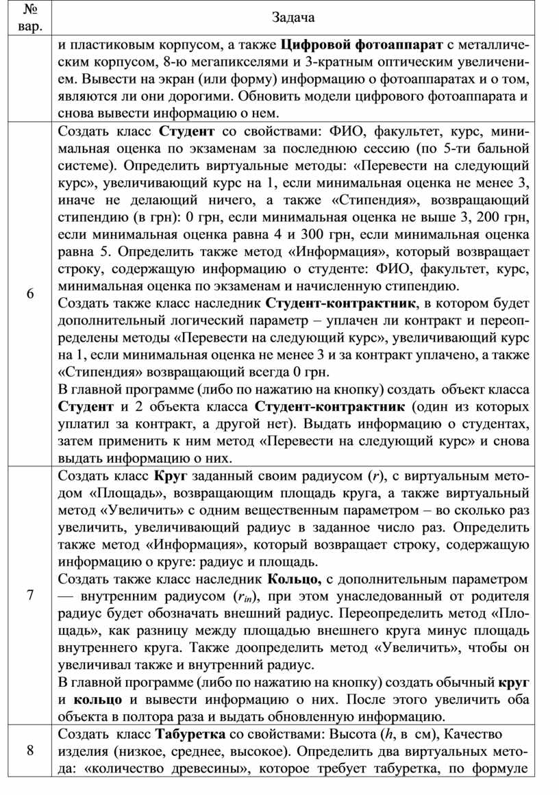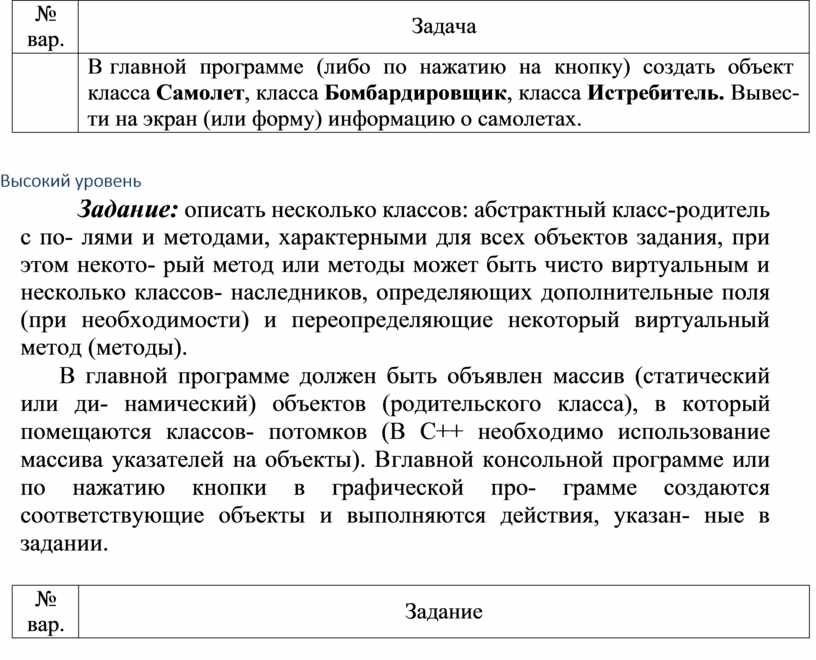В главной программе должен быть объявлен массив (статический или ди- намический) объектов (родительского класса), в который помещаются классов- потомков (В C++ необходимо использование массива указателей на объекты). В главной консольной программе или по нажатию кнопки в графической про- грамме создаются соответствующие объекты и выполняются действия, указан- ные в задании.
