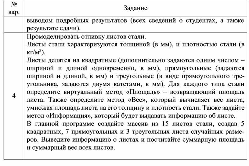 Промоделировать отливку листов стали. Листы стали характеризуются толщиной (в мм), и плотностью стали (в кг/м3). Листы делятся на квадратные (дополнительно задаются одним числом – шириной и длиной одновременно, в мм), прямоугольные (задаются шириной и длиной, в мм) и треугольные (в виде прямоугольного тре- угольника, задаются двумя катетами, в мм). Для каждого типа стали определите виртуальный метод «Площадь» – возвращающий площадь листа. Также определите метод «Вес», который вычисляет вес листа, умножая площадь листа на его толщину и плотность стали. Также задайте метод «Информация», который будет выдавать информацию об листе. В главной программе создайте массив из 15 листов стали, создав 5 квадратных, 7 прямоугольных и 3 треугольных листа случайных разме- ров. Выведите информацию о листах и посчитайте суммарную площадь и суммарный вес всех листов. |