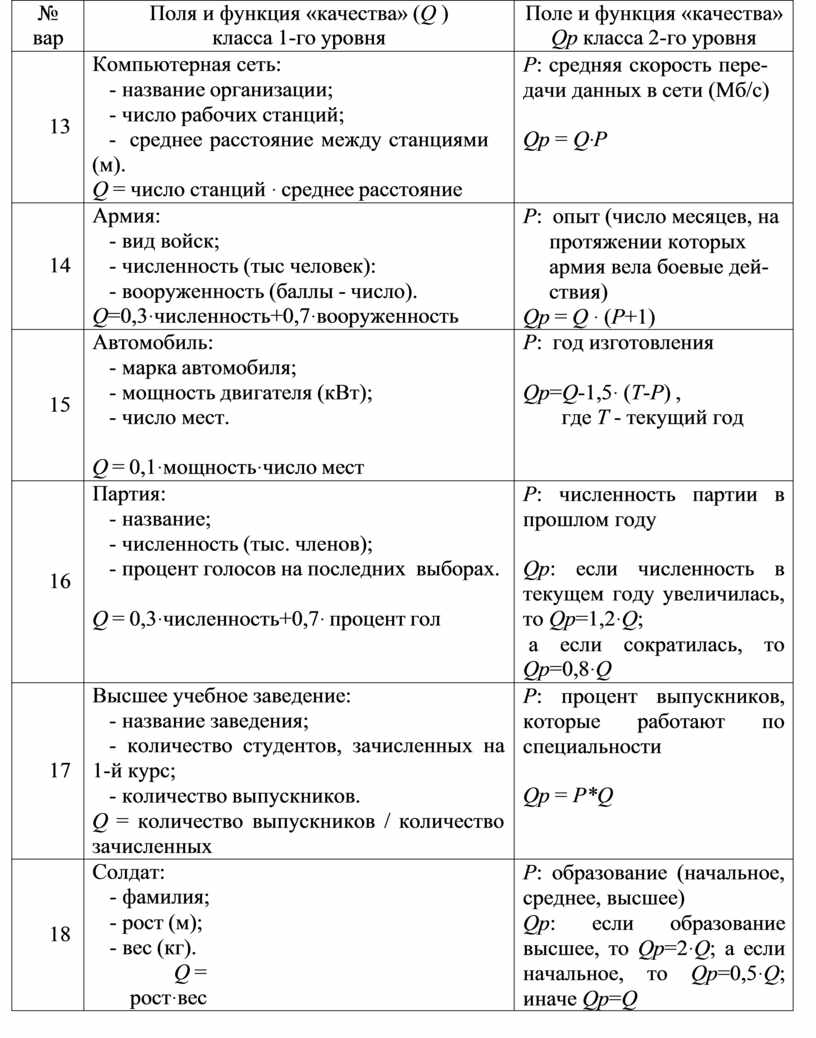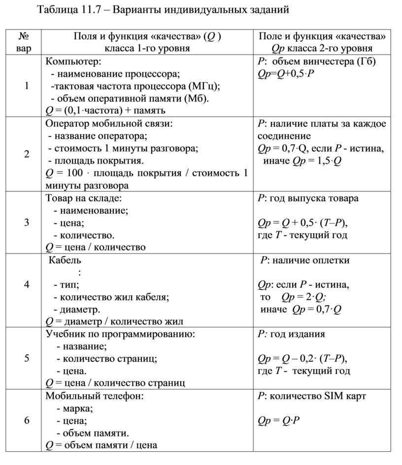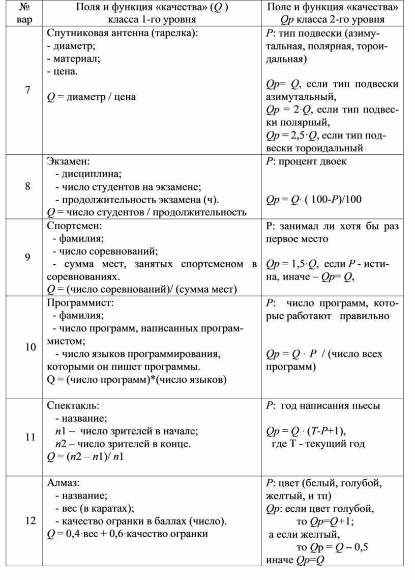 - функция, которая определяет «качество» объекта класса 2-го уровня – Qp, которая перекрывает функцию качества класса 1-го уровня (Q ), выполняя вычисление по новой формуле (табл. 11.7, столб 3).