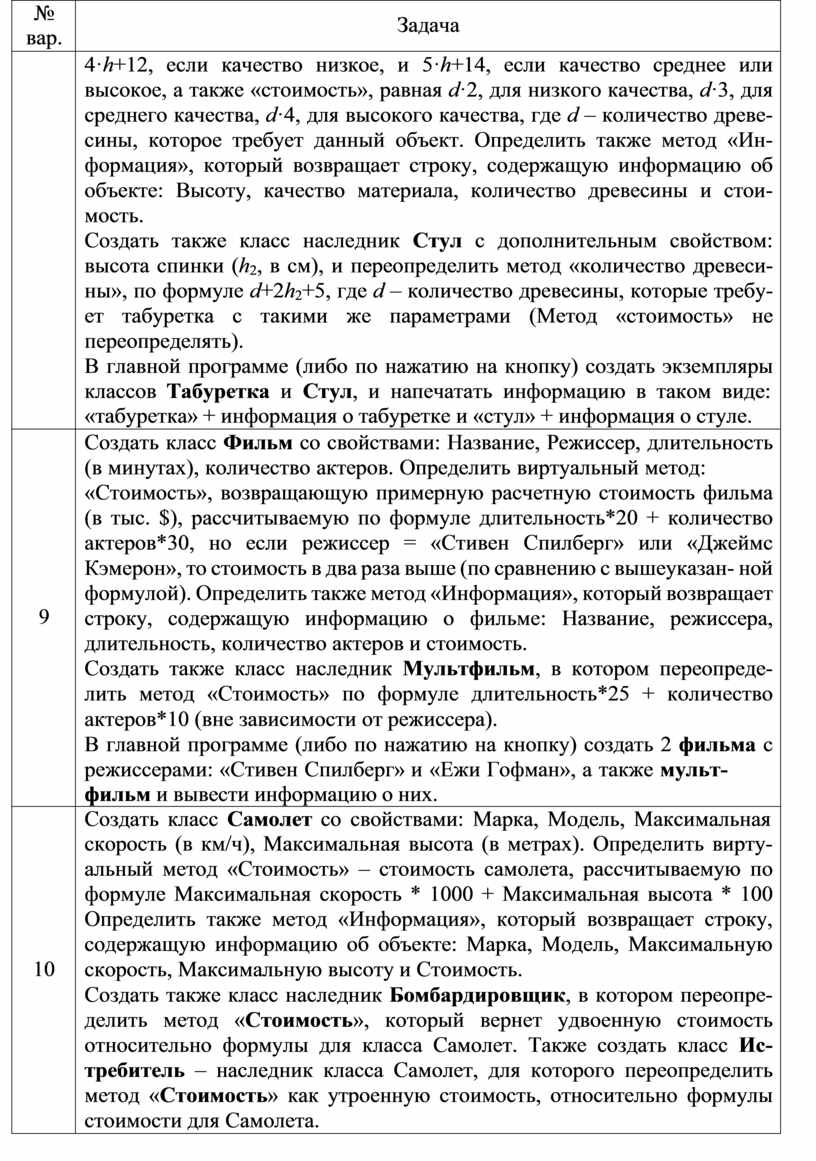 4·h+12, если качество низкое, и 5·h+14, если качество среднее или высокое, а также «стоимость», равная d·2, для низкого качества, d·3, для среднего качества, d·4, для высокого качества, где d – количество древе- сины, которое требует данный объект. Определить также метод «Ин- формация», который возвращает строку, содержащую информацию об объекте: Высоту, качество материала, количество древесины и стои- мость. Создать также класс наследник Стул с дополнительным свойством: высота спинки (h2, в см), и переопределить метод «количество древеси- ны», по формуле d+2h2+5, где d – количество древесины, которые требу- ет табуретка с такими же параметрами (Метод «стоимость» не переопределять). В главной программе (либо по нажатию на кнопку) создать экземпляры классов Табуретка и Стул, и напечатать информацию в таком виде: «табуретка» + информация о табуретке и «стул» + информация о стуле. |