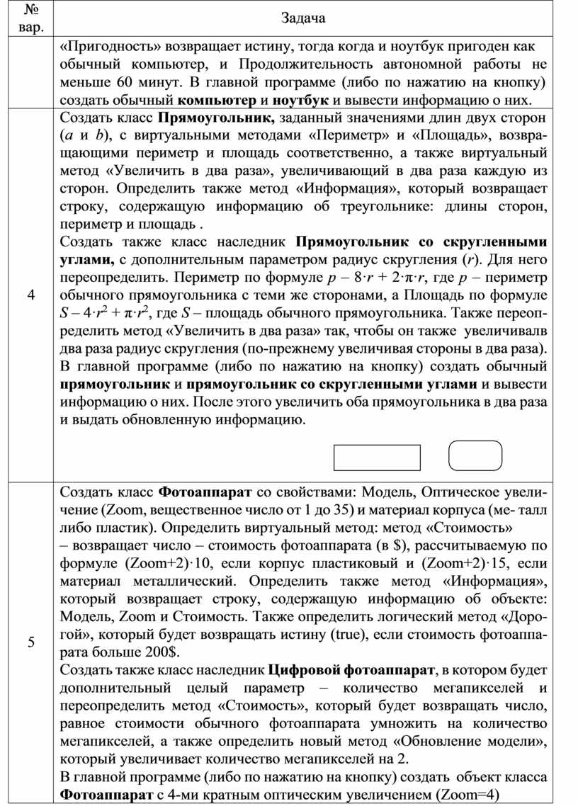 Создать класс Прямоугольник, заданный значениями длин двух сторон (a и b), с виртуальными методами «Периметр» и «Площадь», возвра- щающими периметр и площадь соответственно, а также виртуальный метод «Увеличить в два раза», увеличивающий в два раза каждую из сторон. Определить также метод «Информация», который возвращает строку, содержащую информацию об треугольнике: длины сторон, периметр и площадь . Создать также класс наследник Прямоугольник со скругленными углами, с дополнительным параметром радиус скругления (r). Для него переопределить. Периметр по формуле p – 8·r + 2·π·r, где p – периметр обычного прямоугольника с теми же сторонами, а Площадь по формуле S – 4·r2 + π·r2, где S – площадь обычного прямоугольника. Также переоп- ределить метод «Увеличить в два раза» так, чтобы он также увеличивал в два раза радиус скругления (по-прежнему увеличивая стороны в два раза). В главной программе (либо по нажатию на кнопку) создать обычный прямоугольник и прямоугольник со скругленными углами и вывести информацию о них. После этого увеличить оба прямоугольника в два раза и выдать обновленную информацию. |