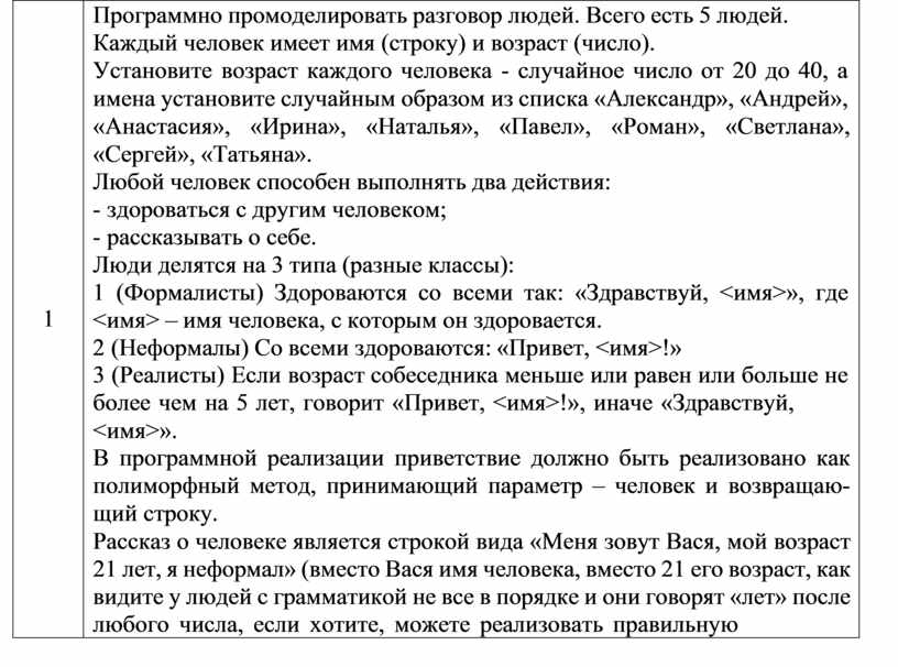Программно промоделировать разговор людей. Всего есть 5 людей. Каждый человек имеет имя (строку) и возраст (число). Установите возраст каждого человека - случайное число от 20 до 40, а имена установите случайным образом из списка «Александр», «Андрей», «Анастасия», «Ирина», «Наталья», «Павел», «Роман», «Светлана», «Сергей», «Татьяна». Любой человек способен выполнять два действия: - здороваться с другим человеком; - рассказывать о себе. Люди делятся на 3 типа (разные классы): 1 (Формалисты) Здороваются со всеми так: «Здравствуй, <имя>», где <имя> – имя человека, с которым он здоровается. 2 (Неформалы) Со всеми здороваются: «Привет, <имя>!» 3 (Реалисты) Если возраст собеседника меньше или равен или больше не более чем на 5 лет, говорит «Привет, <имя>!», иначе «Здравствуй, <имя>». В программной реализации приветствие должно быть реализовано как полиморфный метод, принимающий параметр – человек и возвращаю- щий строку. Рассказ о человеке является строкой вида «Меня зовут Вася, мой возраст 21 лет, я неформал» (вместо Вася имя человека, вместо 21 его возраст, как видите у людей с грамматикой не все в порядке и они говорят «лет» после любого числа, если хотите, можете реализовать правильную |