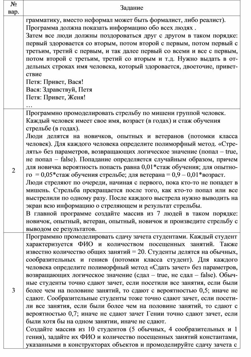 Программно промоделировать сдачу зачета студентами. Каждый студент характеризуется ФИО и количеством посещенных занятий. Также известно количество общих занятий = 20. Студенты делятся на обычных, сообразительных и гениев (потомки класса студент). Для каждого человека определите полиморфный метод «Сдать зачет» без параметров, возвращающих логическое значение (сдал – true, не сдал – false). Обыч- ные студенты точно сдают зачет, если посетили все занятия, если были более чем на половине занятий, то сдают с вероятностью 0,5; иначе не сдают. Сообразительные студенты тоже точно сдают зачет, если посети- ли все занятия, если были более чем на половине занятий, то сдают с вероятностью 0,7; иначе не сдают зачет Гении точно сдают зачет, если были хотя бы на одном занятии, иначе не сдают. Создайте массив из 10 студентов (5 обычных, 4 сообразительных и 1 гения), задайте их ФИО и количество посещенных занятий константами, указанными в конструкторах объектов и промоделируйте сдачу зачета с |