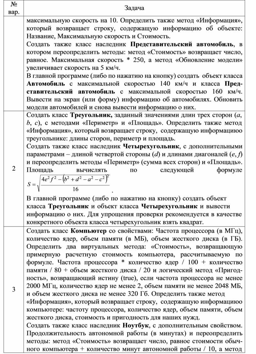 Задание: описать несколько классов: абстрактный класс-родитель с по- лями и методами, характерными для всех объектов задания, при этом некото- рый метод или методы может быть чисто виртуальным и несколько классов- наследников, определяющих дополнительные поля (при необходимости) и переопределяющие некоторый виртуальный метод (методы).