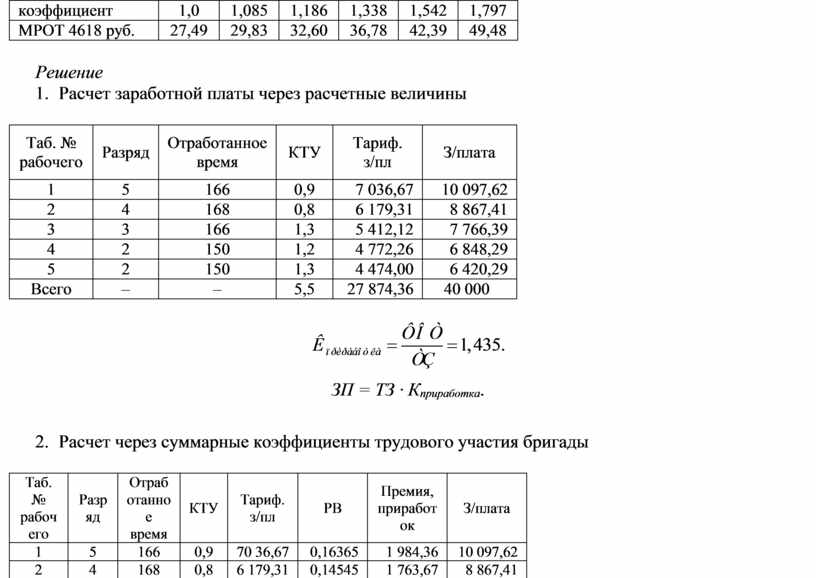 Исходные данные и постановка задачи. Фонд оплаты труда, установленный строительной бригаде, составил 40 000 руб. Численность работников бригады – 5 человек, в том числе: 2 работника 5-го разряда, 2 работника 4-го разряда, 1 работник 3-го разряда, 2 работника 2-го разряда. Фактически отработано времени работниками соответственно: 166 ч, 168 ч, 166 ч, 160 ч, 150 ч. Бригада работает с применением сдельной формы оплаты труда с распределением премии и приработка по КТУ. Величина КТУ рабочих составила соответственно: 0,9; 08; 1,3; 1,2; 1,3. Размер тарифной ставки рассчитан из МРОТ, равного 4618 руб. Определите величину заработной платы каждого работника бригады двумя способами: