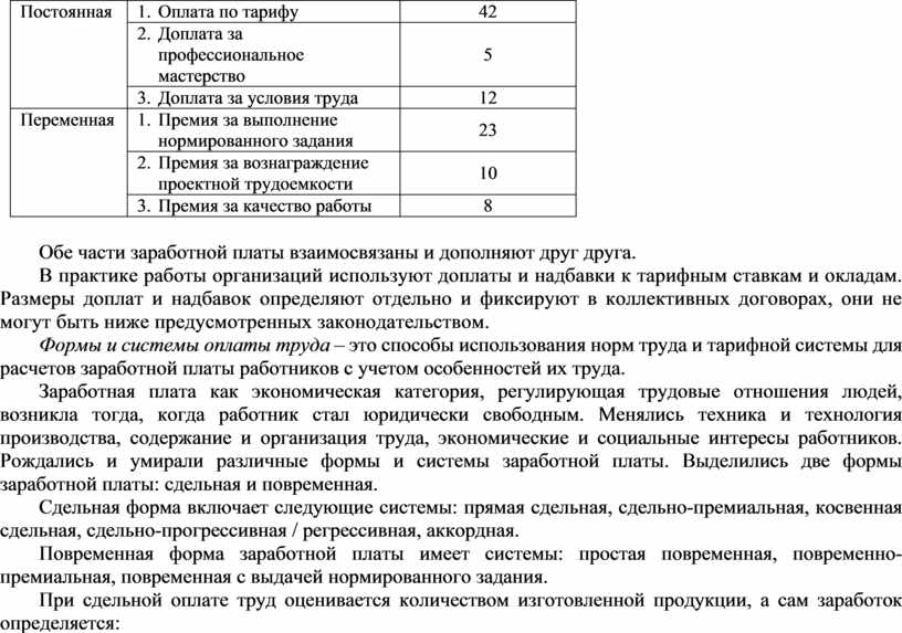 Элементы постоянной части заработной платы отражают характеристики способностей работника к труду. Они количественно определены уже с начала трудового процесса. Получение этой части заработка связано лишь со временем работы (постоянная часть).